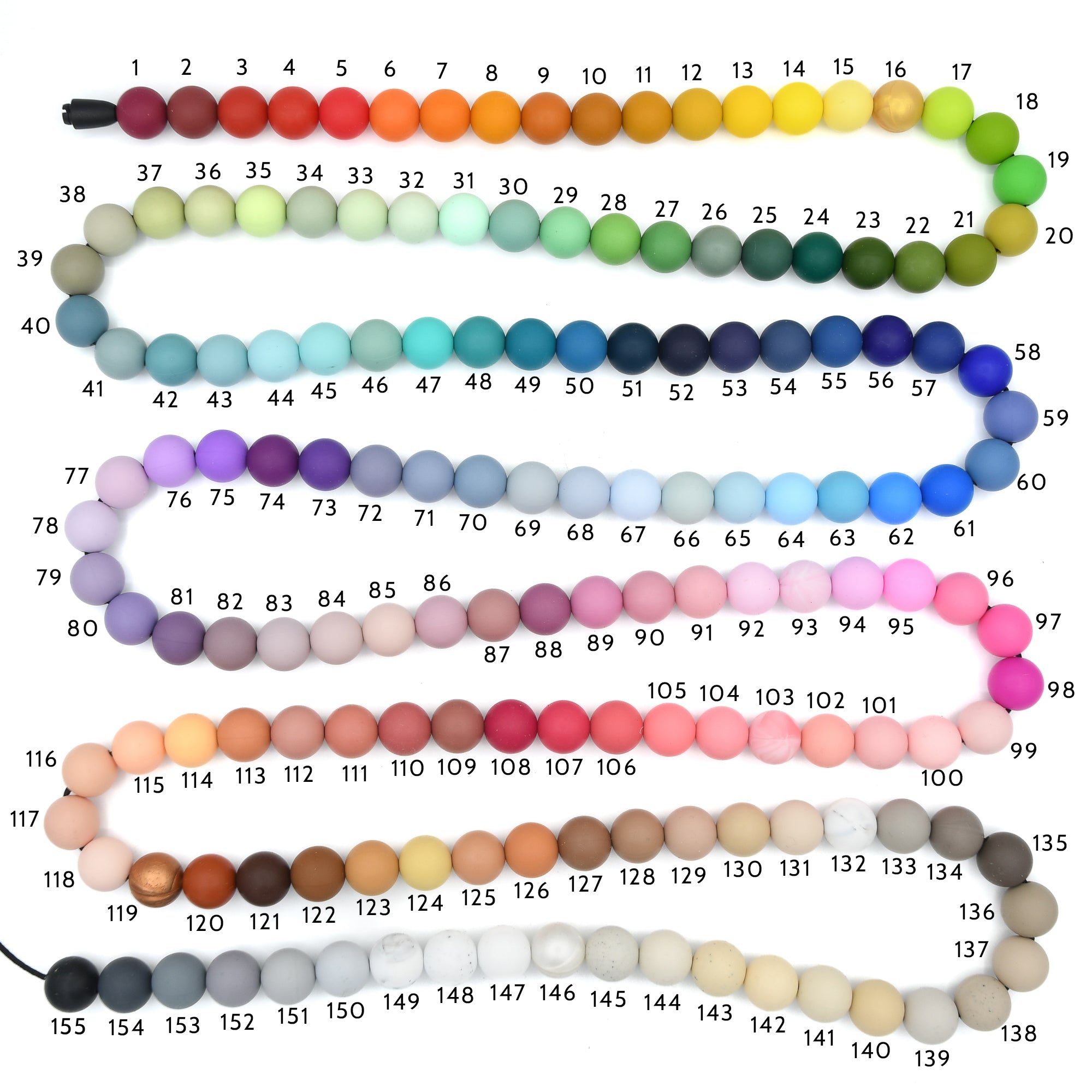 Bij het koord ontvang je een kaartje met alle kleurnamen. Scroll naar beneden voor de complete lijst. Disclaimer: de foto is puur ter indicatie. Het is onmogelijk om 155 kleuren kleurecht op 1 foto te krijgen.)