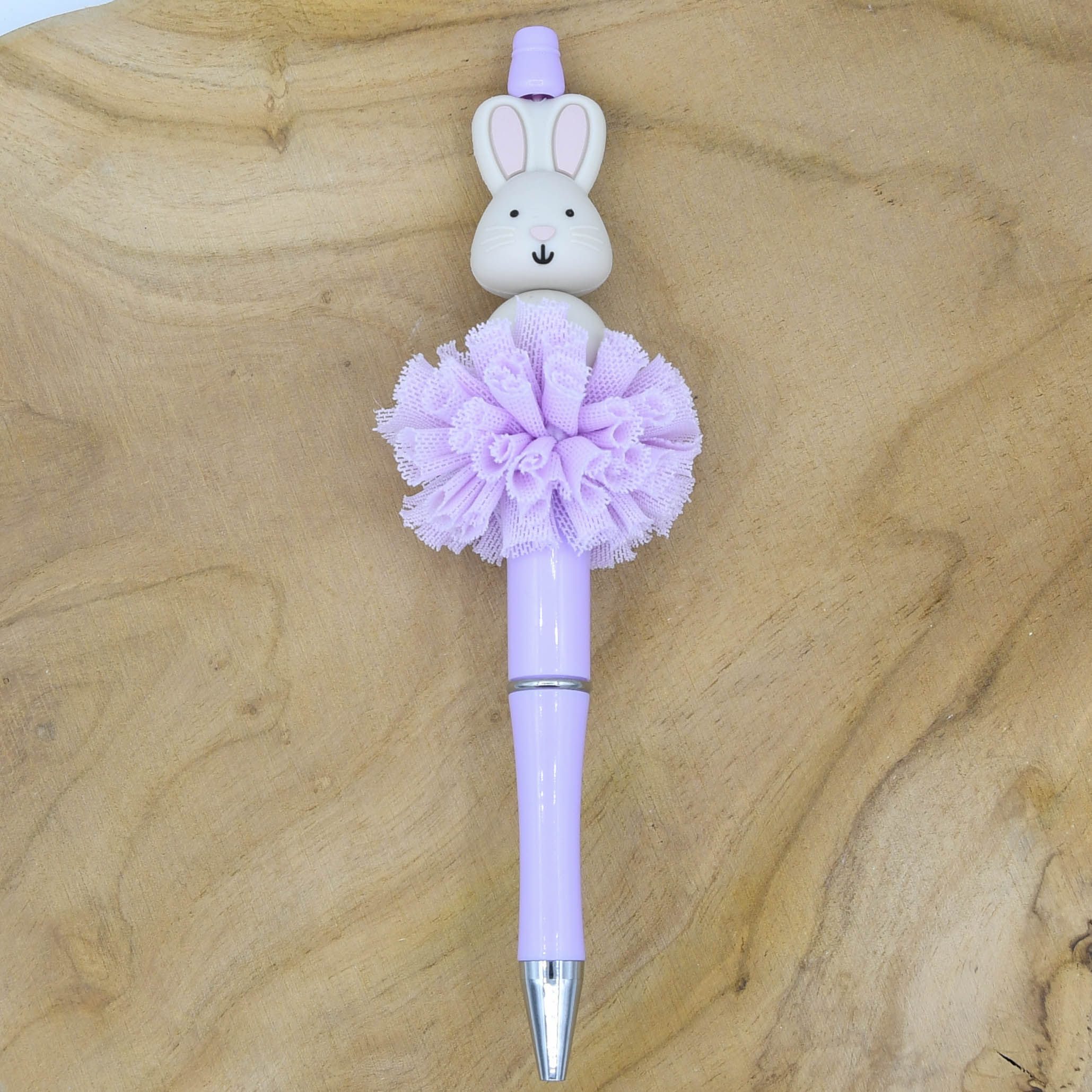 Let op: de pompom heeft geen gat. Je moet zelf het midden vinden, en het staafje van de pen daar doorheen steken.