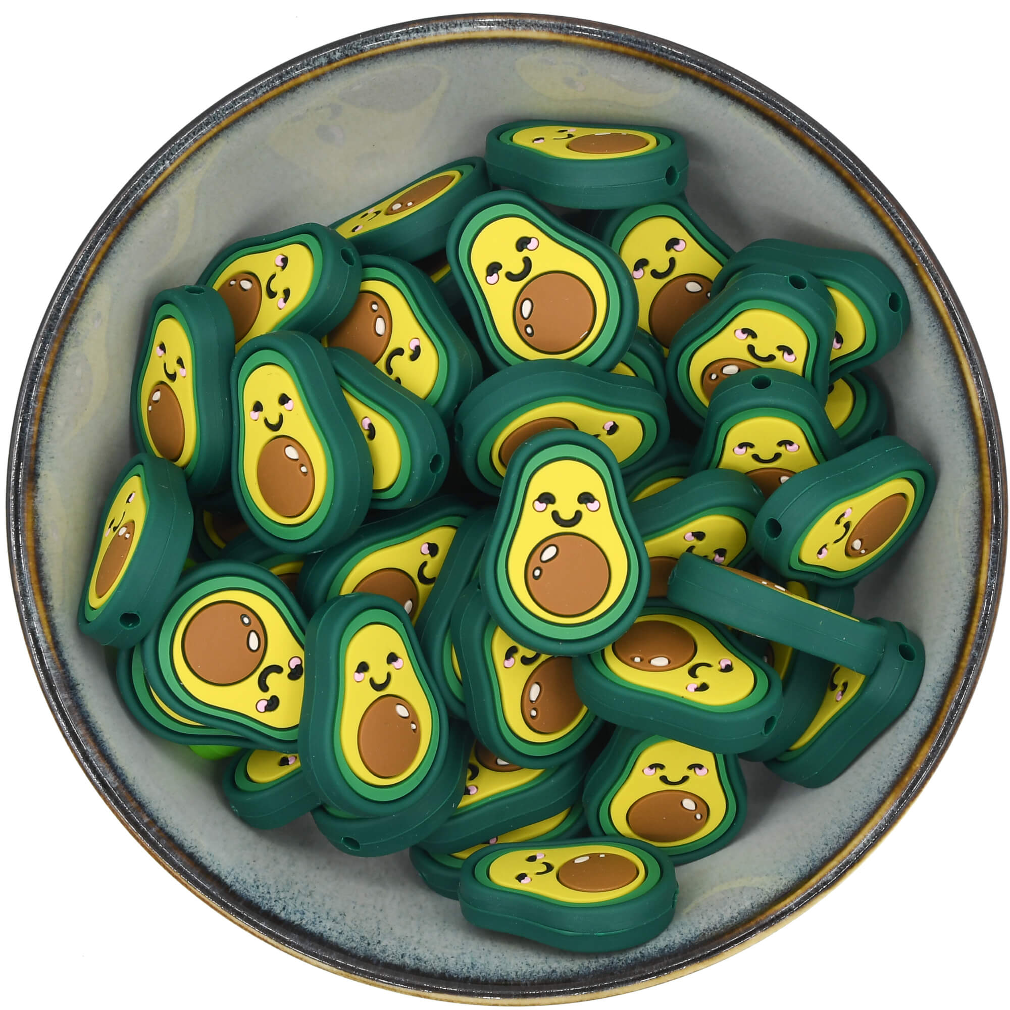 Superleuke avocado met gezichtje. De voor- en achterkant van de kraal is hetzelfde.