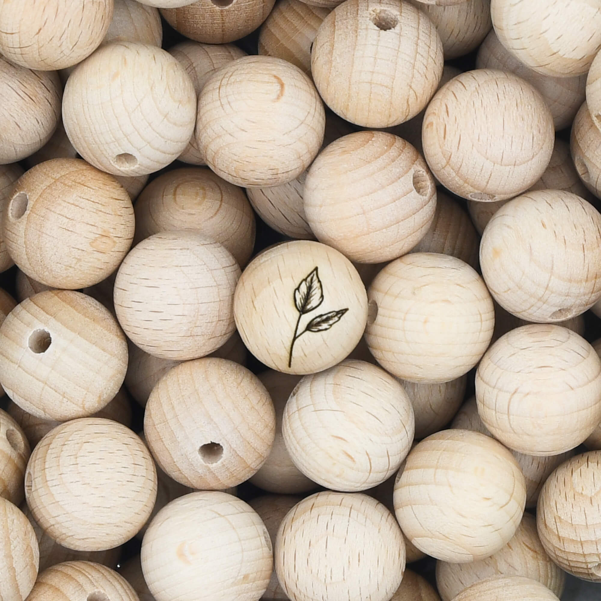 Onbewerkte beukenhouten kraal van 18 mm met een gelaserde afbeelding van blaadjes.