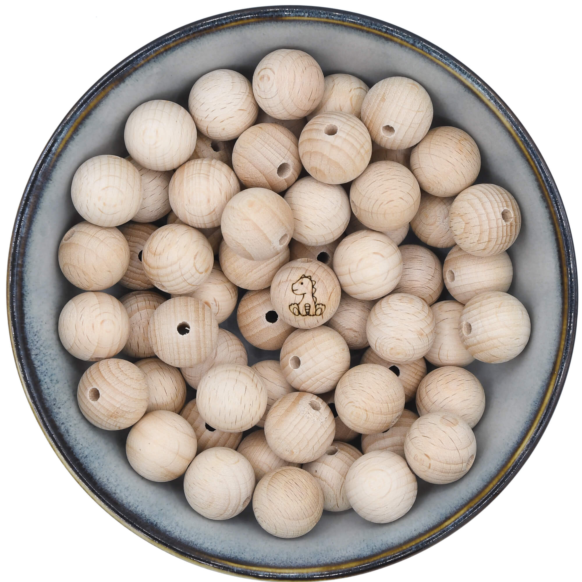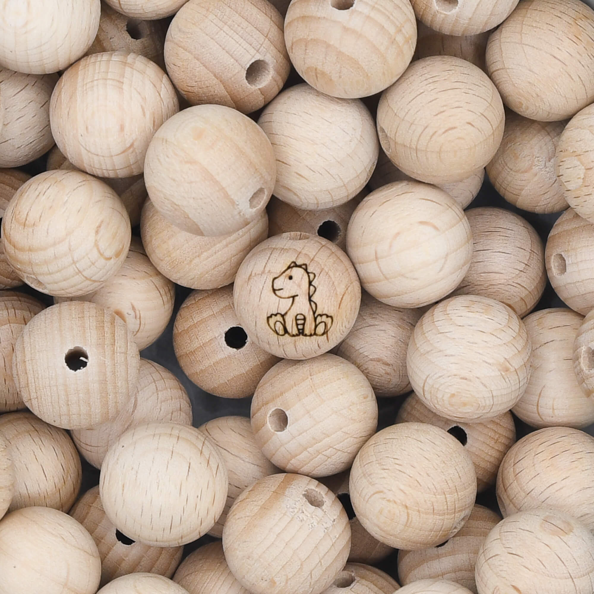 Onbewerkte beukenhouten kraal van 18 mm met een gelaserde afbeelding van een draakje.