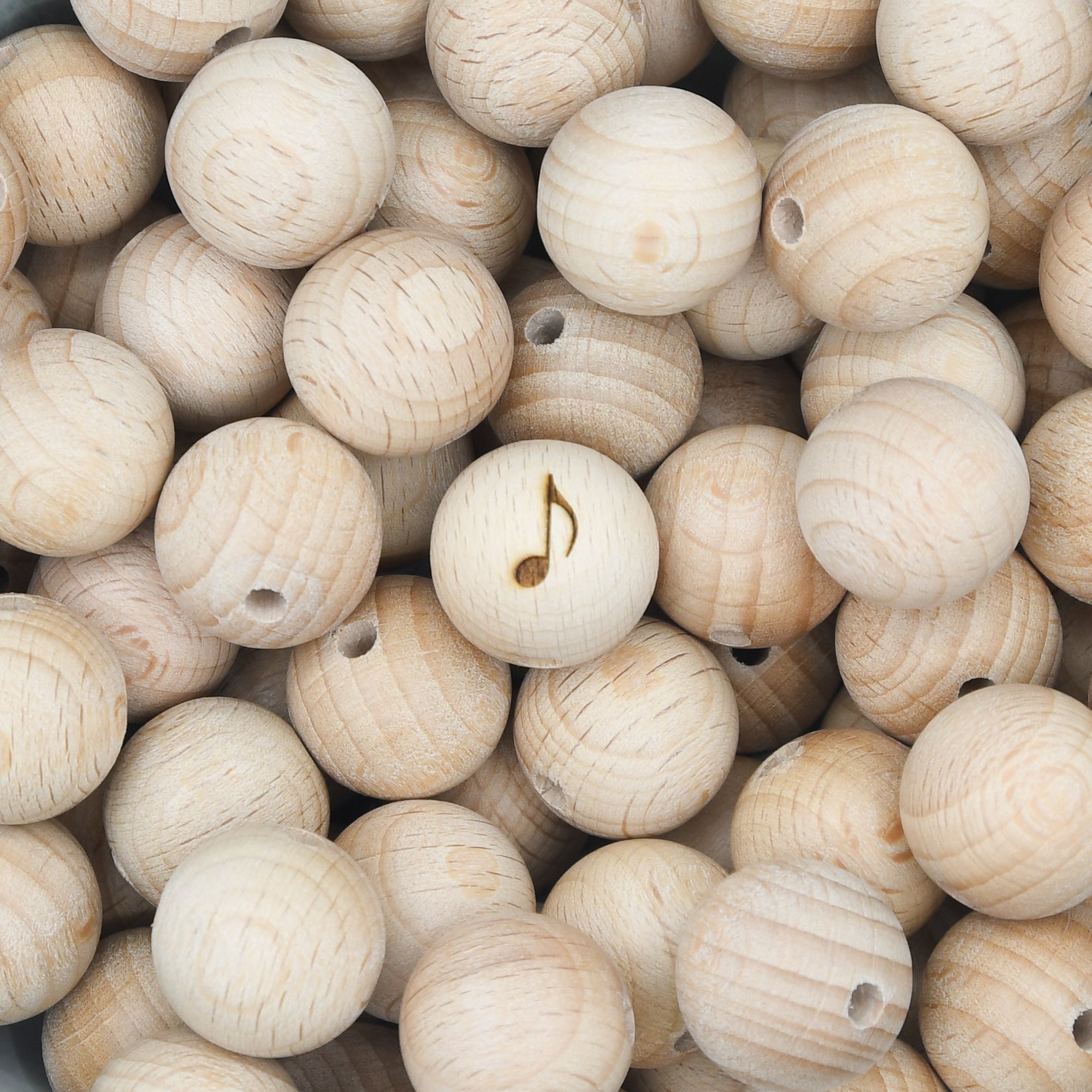 Onbewerkte beukenhouten kraal van 18 mm met een gelaserde afbeelding van een muzieknoot.