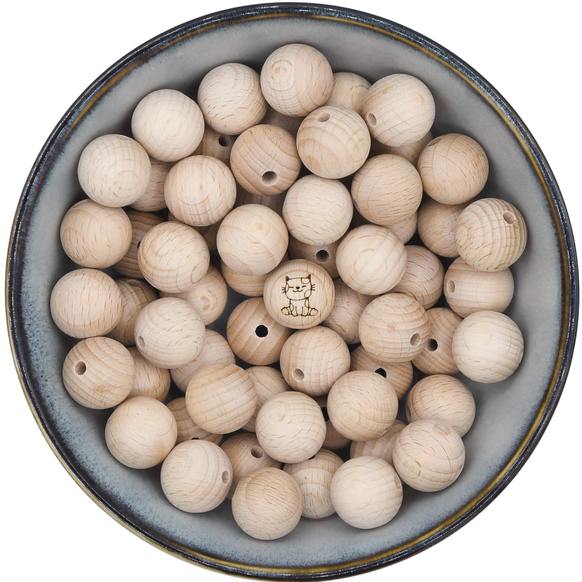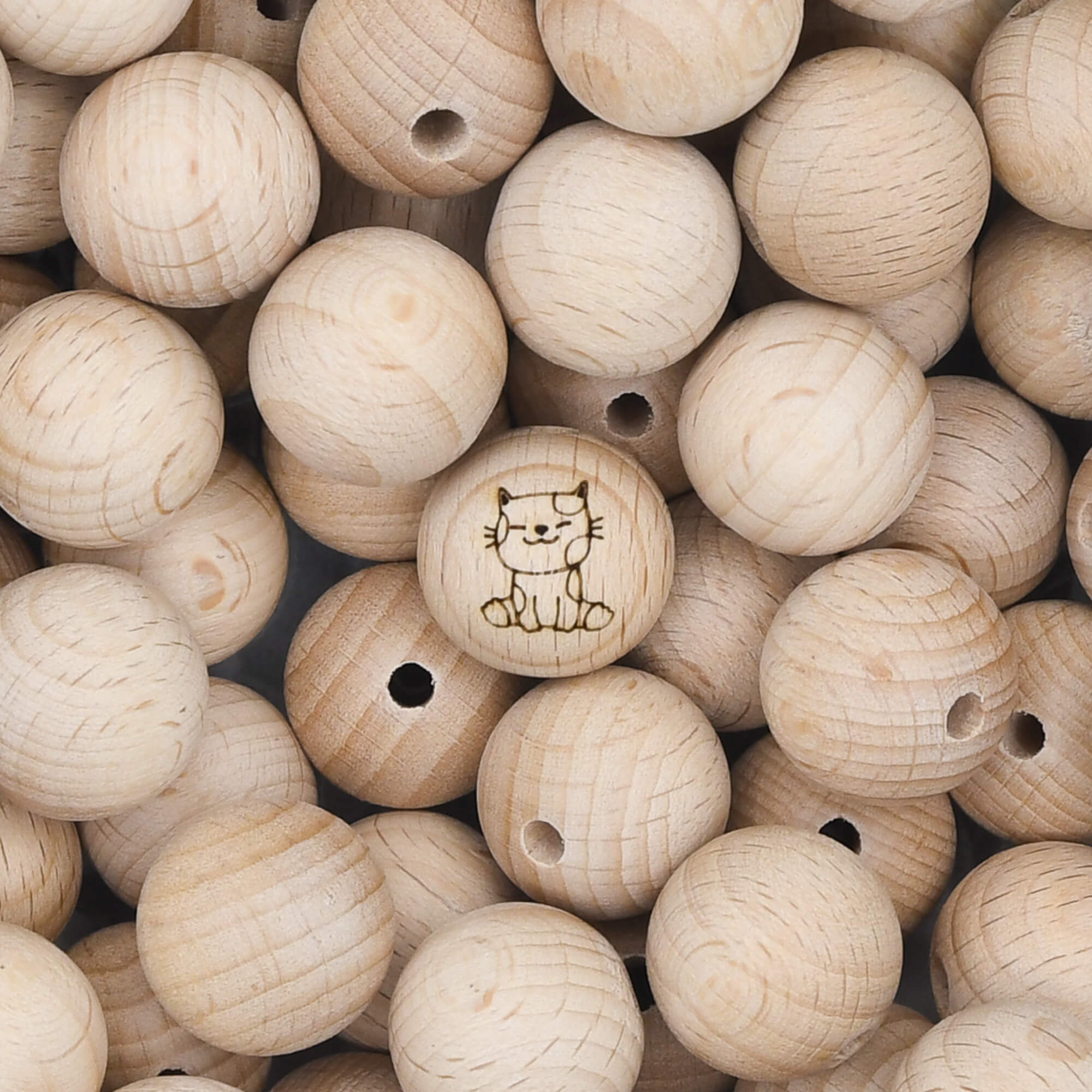 Onbewerkte beukenhouten kraal van 18 mm met een gelaserde afbeelding van een poesje.