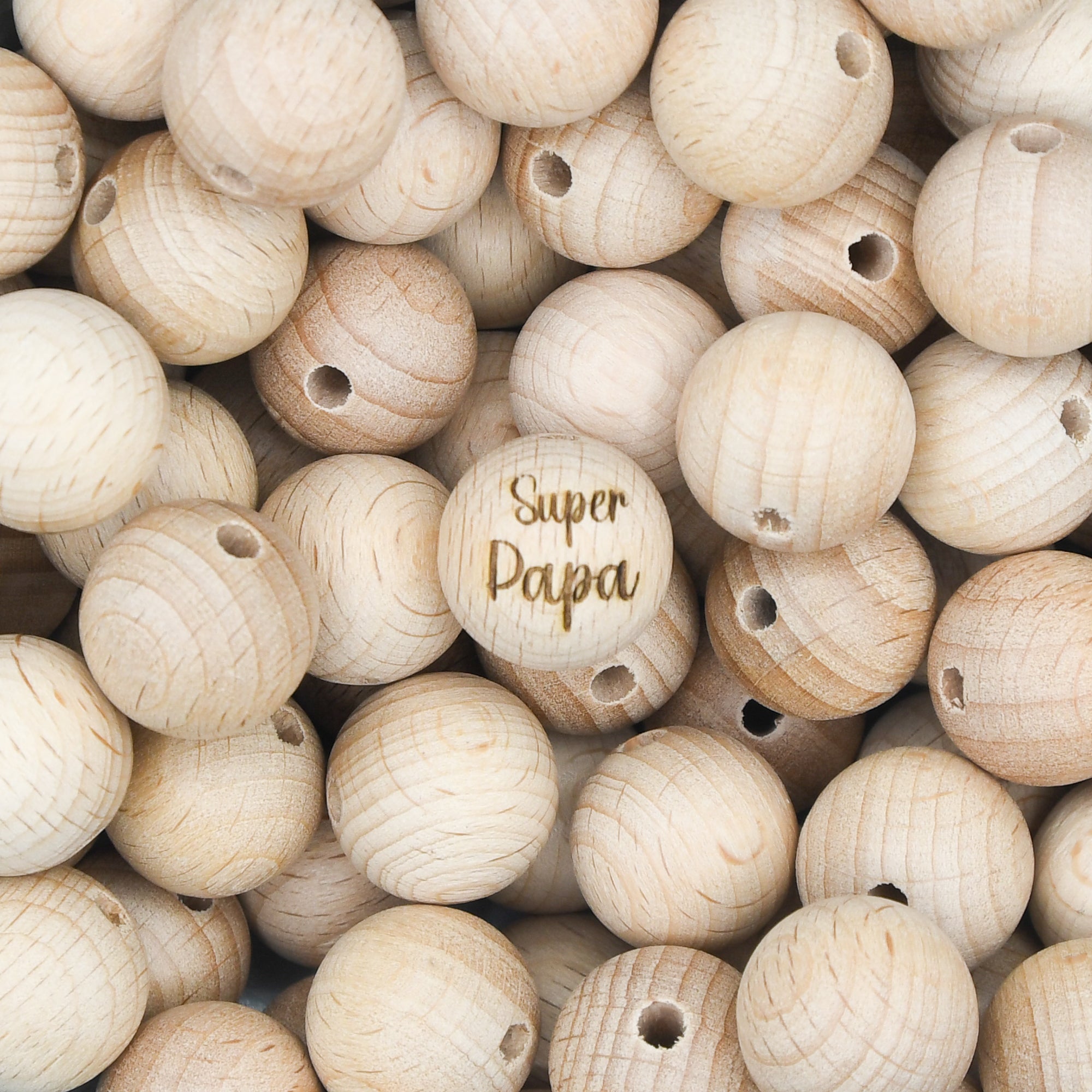 Onbewerkte beukenhouten kraal van 18 mm met een gelaserde tekst.