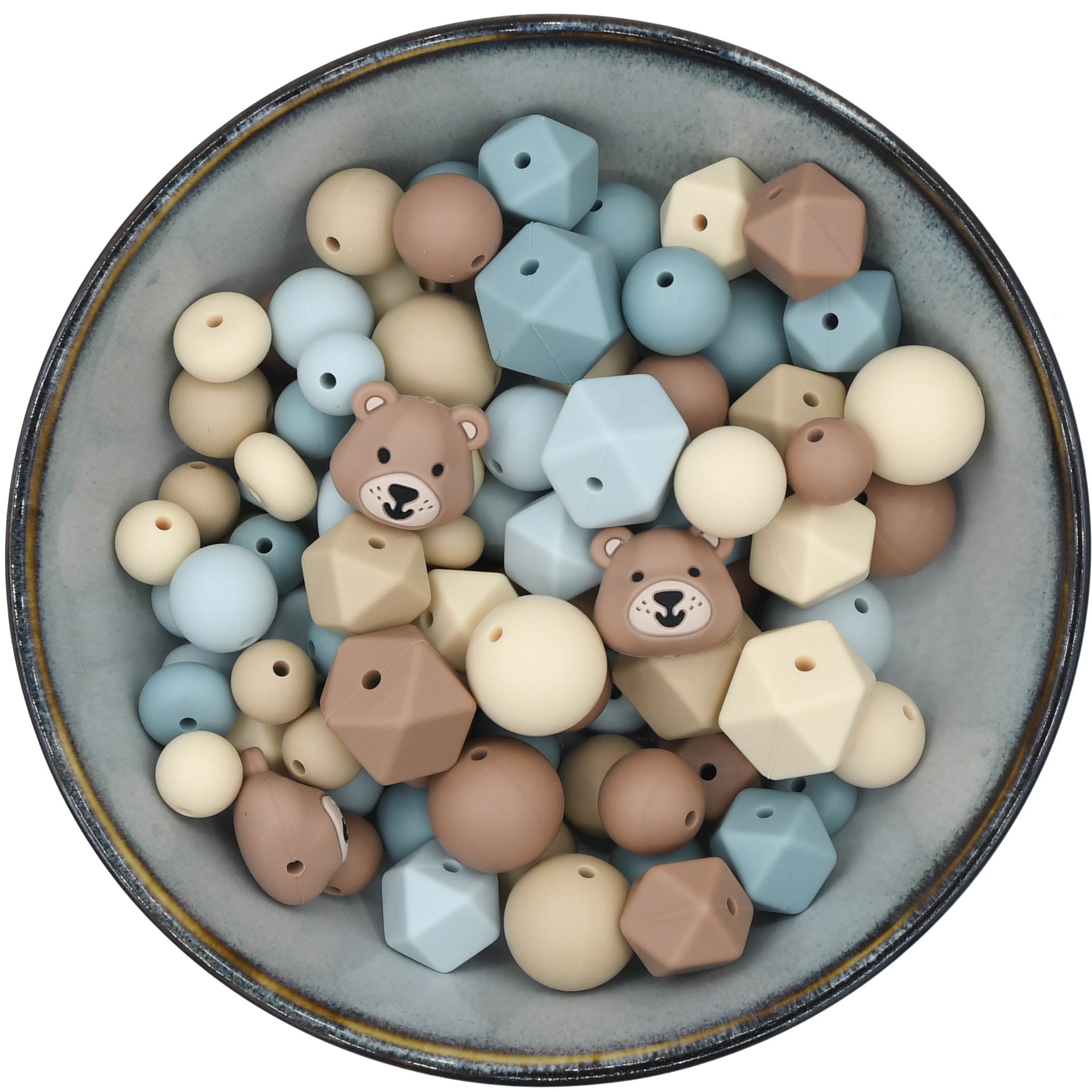 In deze mix vind je de kleuren Grijsblauw, Licht Grijsblauw, Crème, Havermout en Hazelnoot en 4 berenkralen.