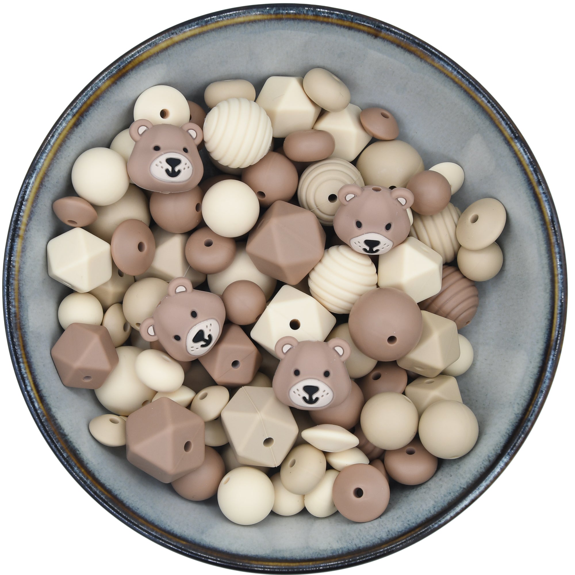 Kralenmix met 4 beertjes, en de vormen 'Abacus 14mm', 'Mini-Hexagon', 'Hexagon', 'Ribbelkraal', 'Tussenschijfje Klein', 'Tussenschijfje Groot, 'Ronde kraal 12mm', 'Ronde kraal 15mm' en 'Ronde kraal 19mm'.