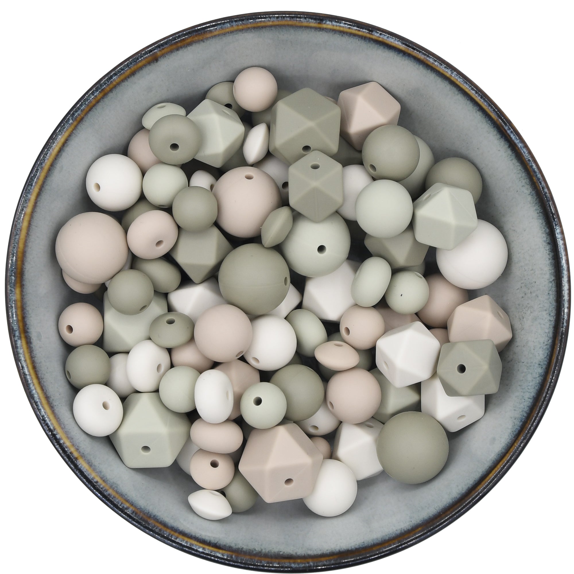 Kralenmix met de vormen 'Abacus 14mm', 'Mini-Hexagon', 'Klein Tussenschijfje', 'Hexagon', 'Ronde kraal 12mm', 'Ronde kraal 15mm' en 'Ronde kraal 19mm'.