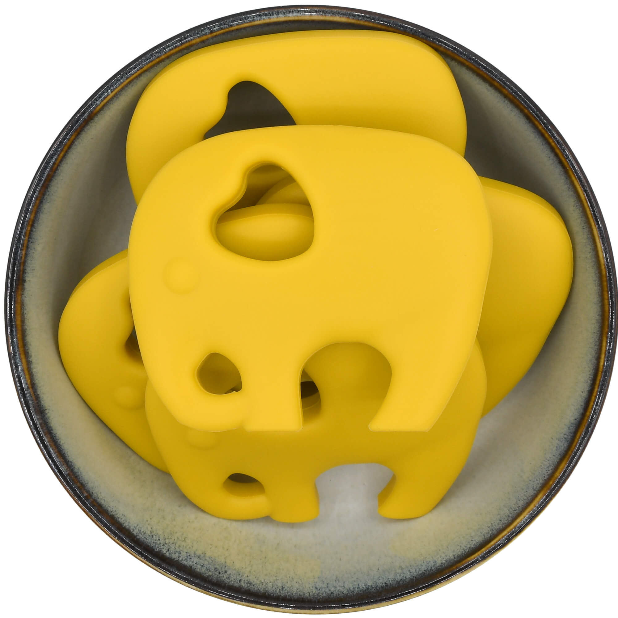 Groot siliconen bijtfiguur in de vorm van een olifant, gemaakt in mijn eigen kleur okergeel.