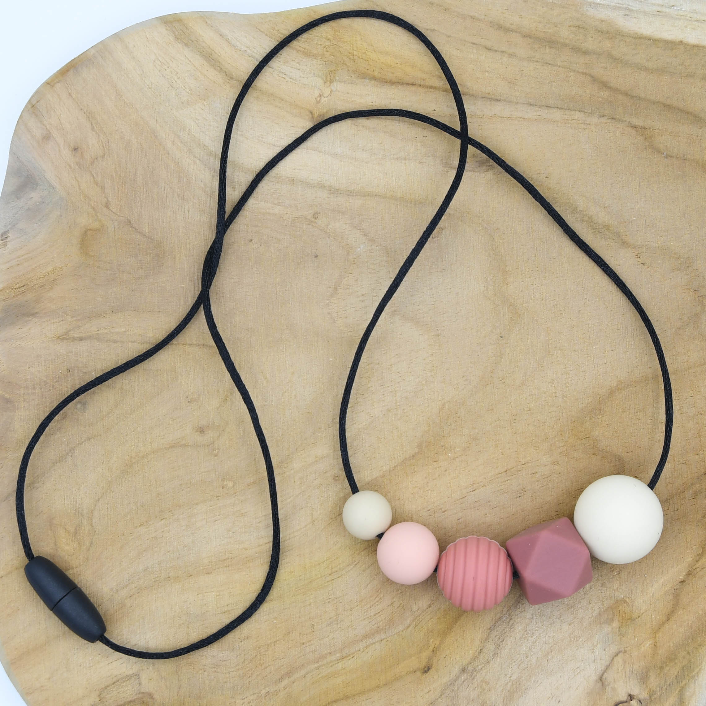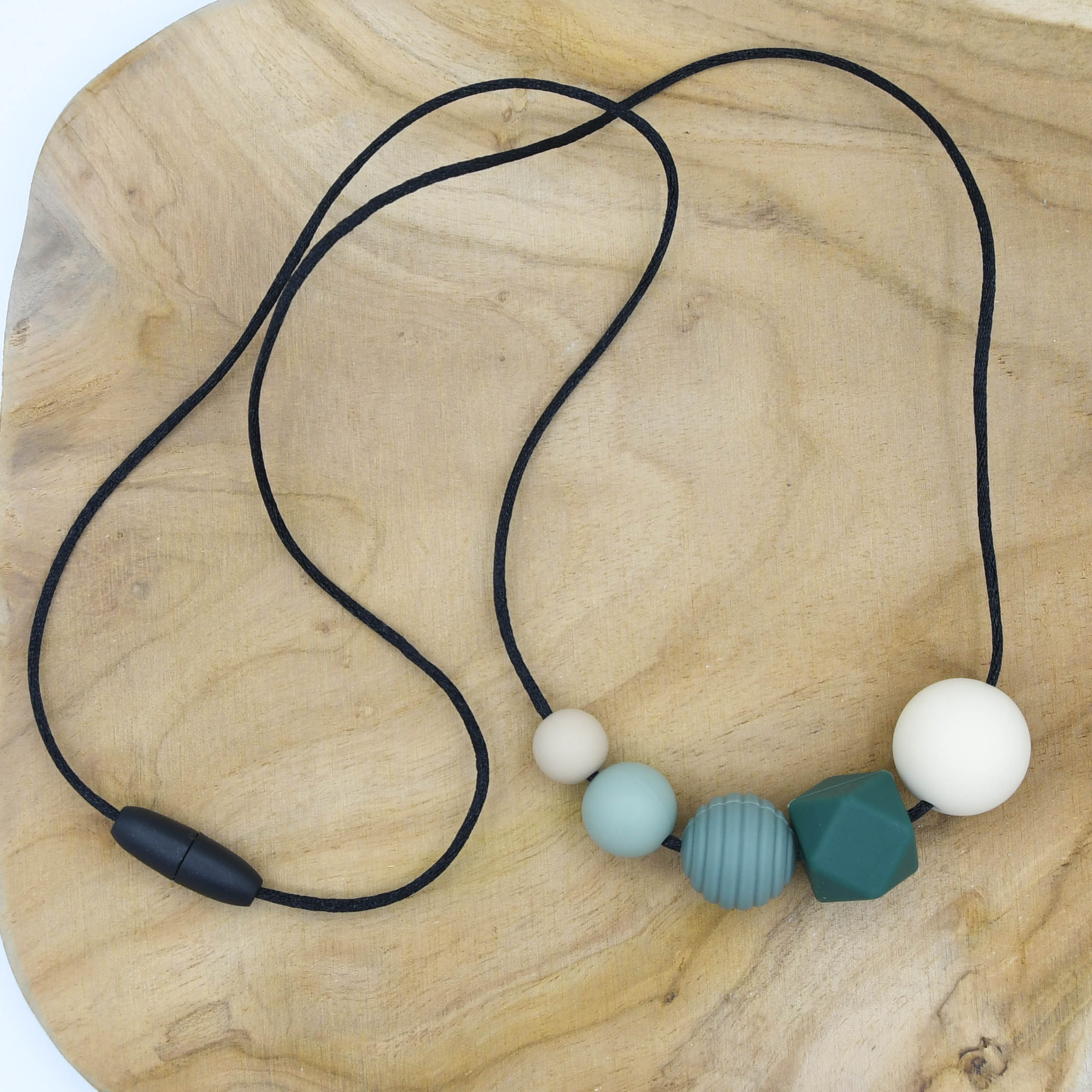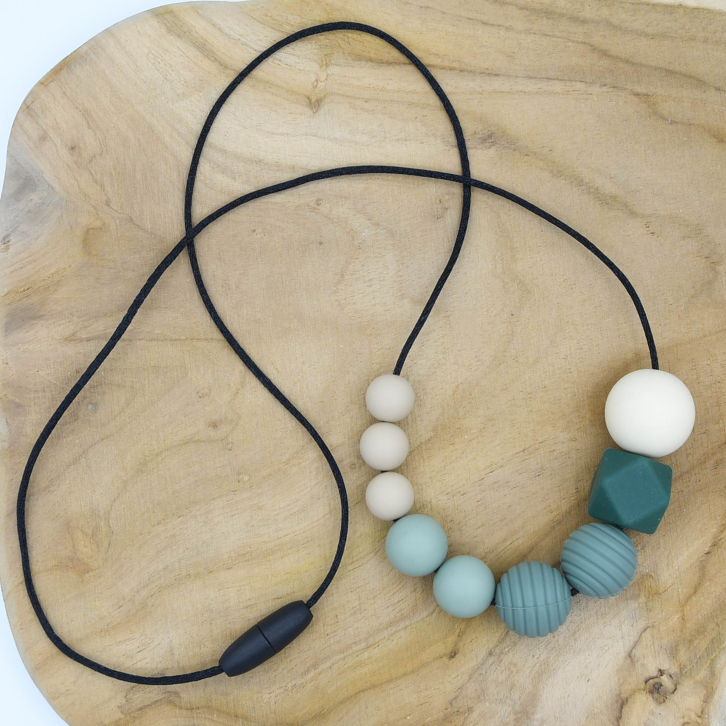 Die verschiedenen Formen und Texturen dieser Halskette sind für Babys sehr angenehm zu spüren und da die Perlen aus zertifiziertem Silikon bestehen, ist die Halskette selbstverständlich auch zum Beißen oder Nuckeln unbedenklich.
