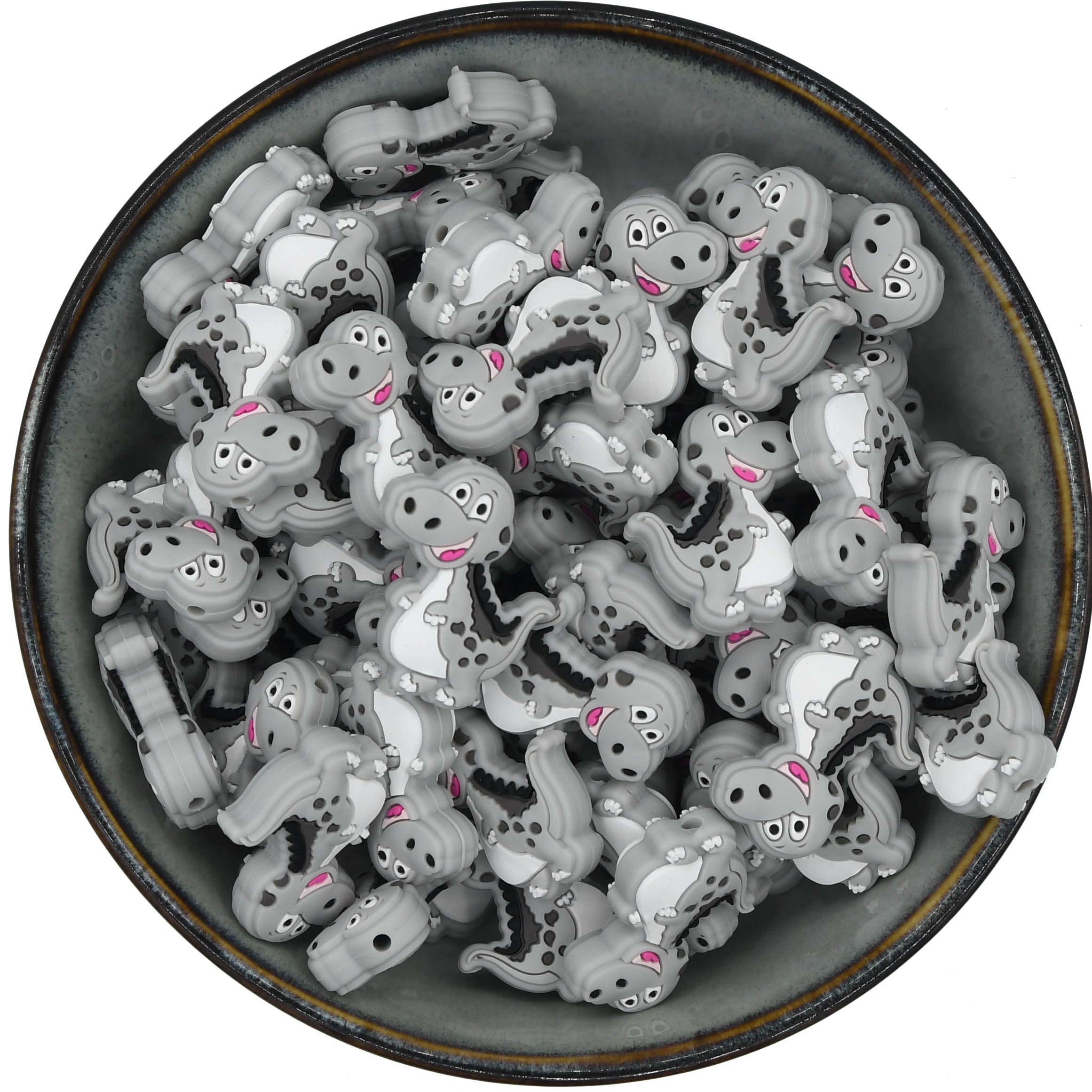 Silicone focal bead in the shape of a cheerful dinosaur.