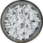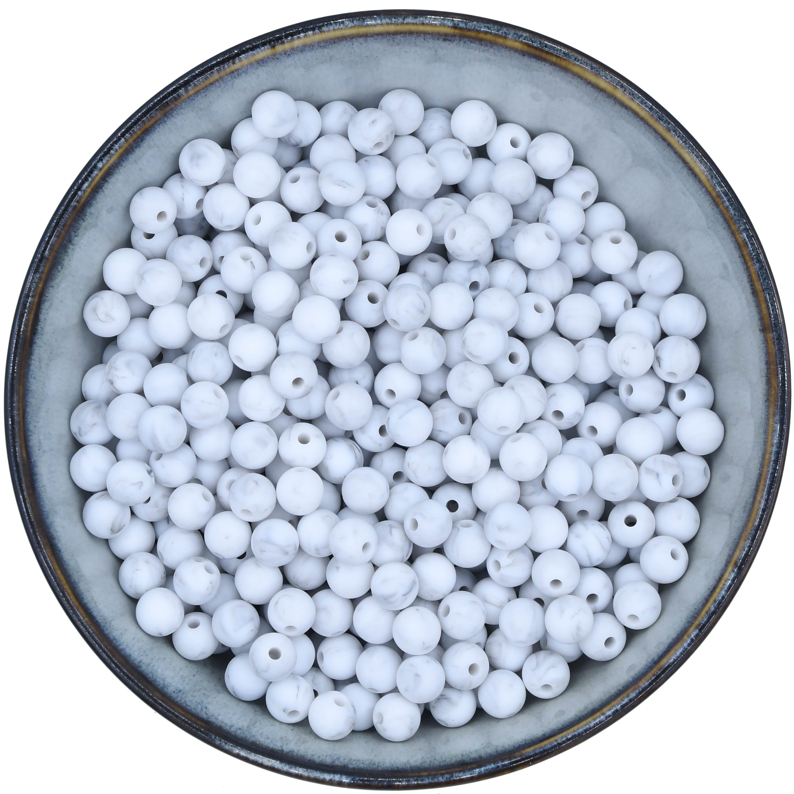 White beads with gray marbling.