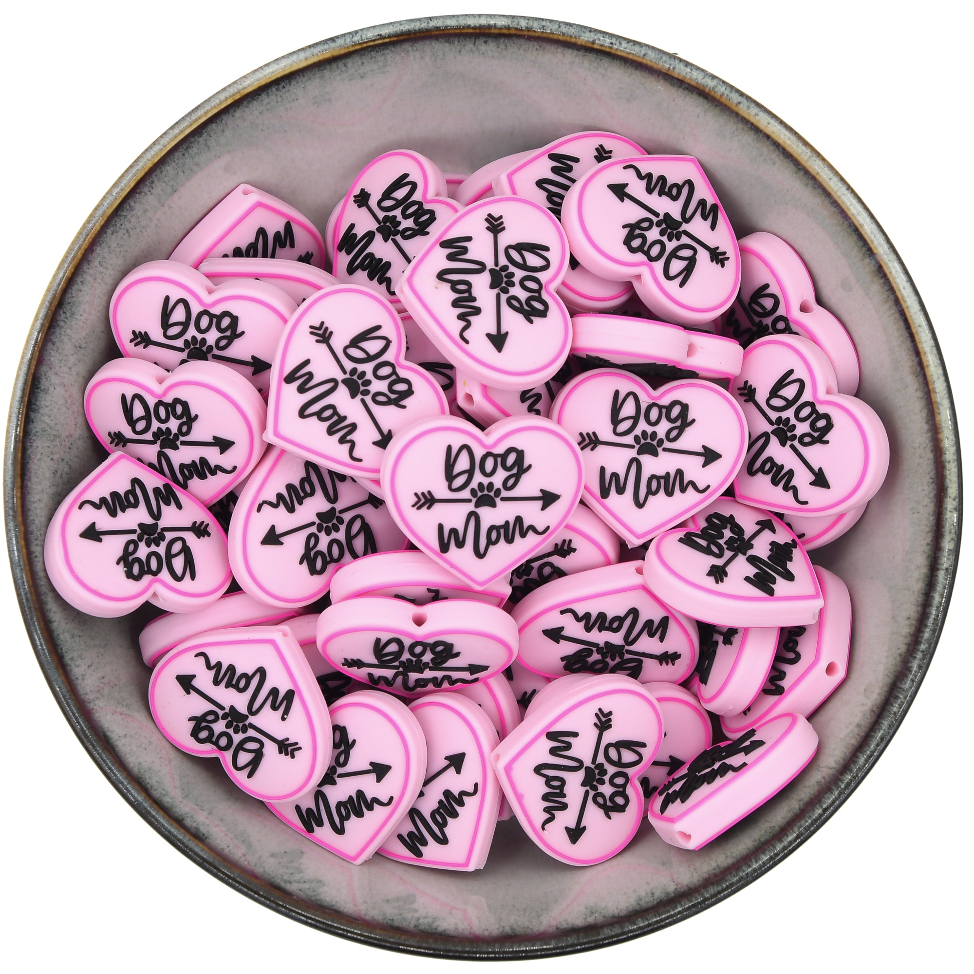 Silicone focal bead in the shape of a heart with the text "Dog Mom"