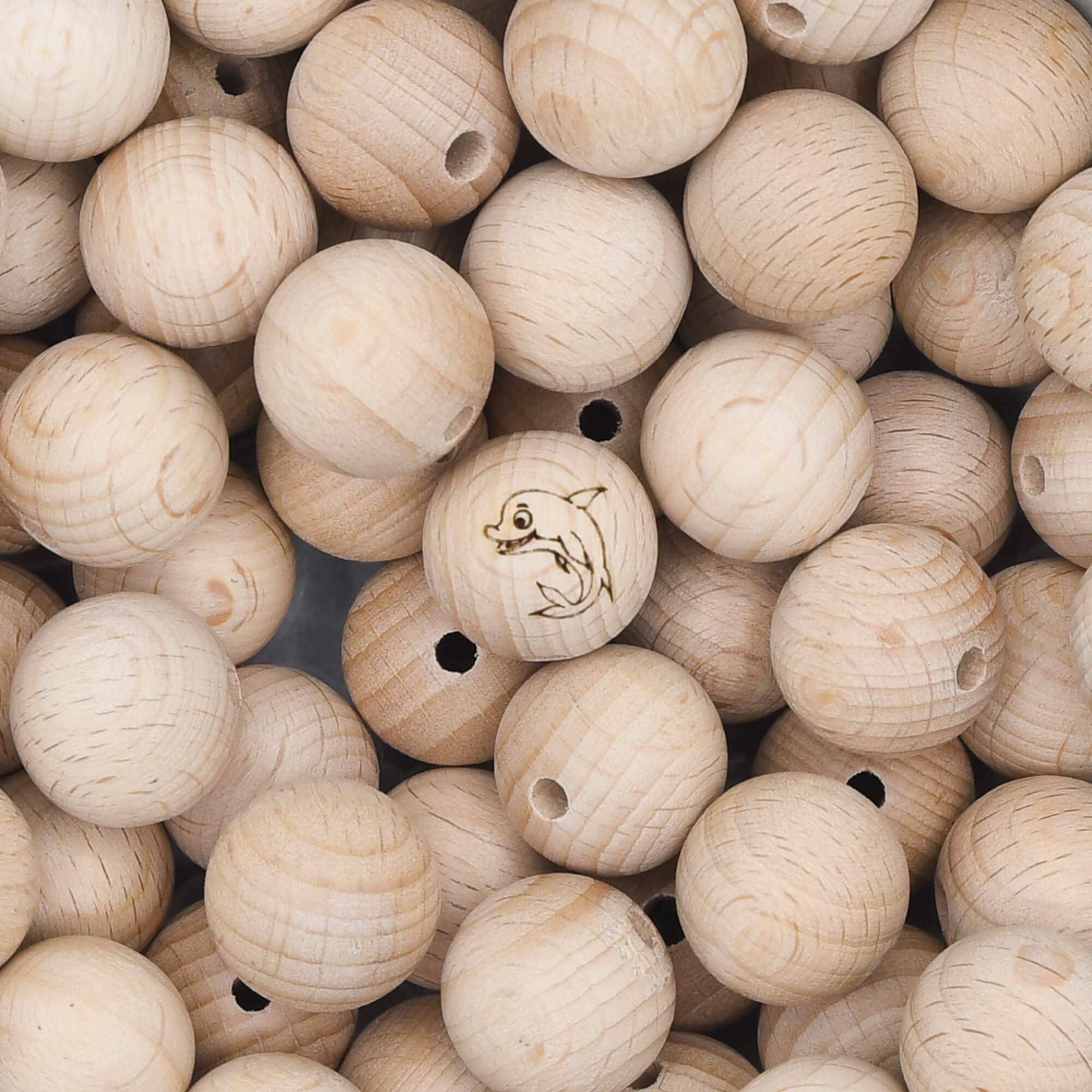 Unprocessed beech wood bead of 18 mm with a lasered image of a dolphin.