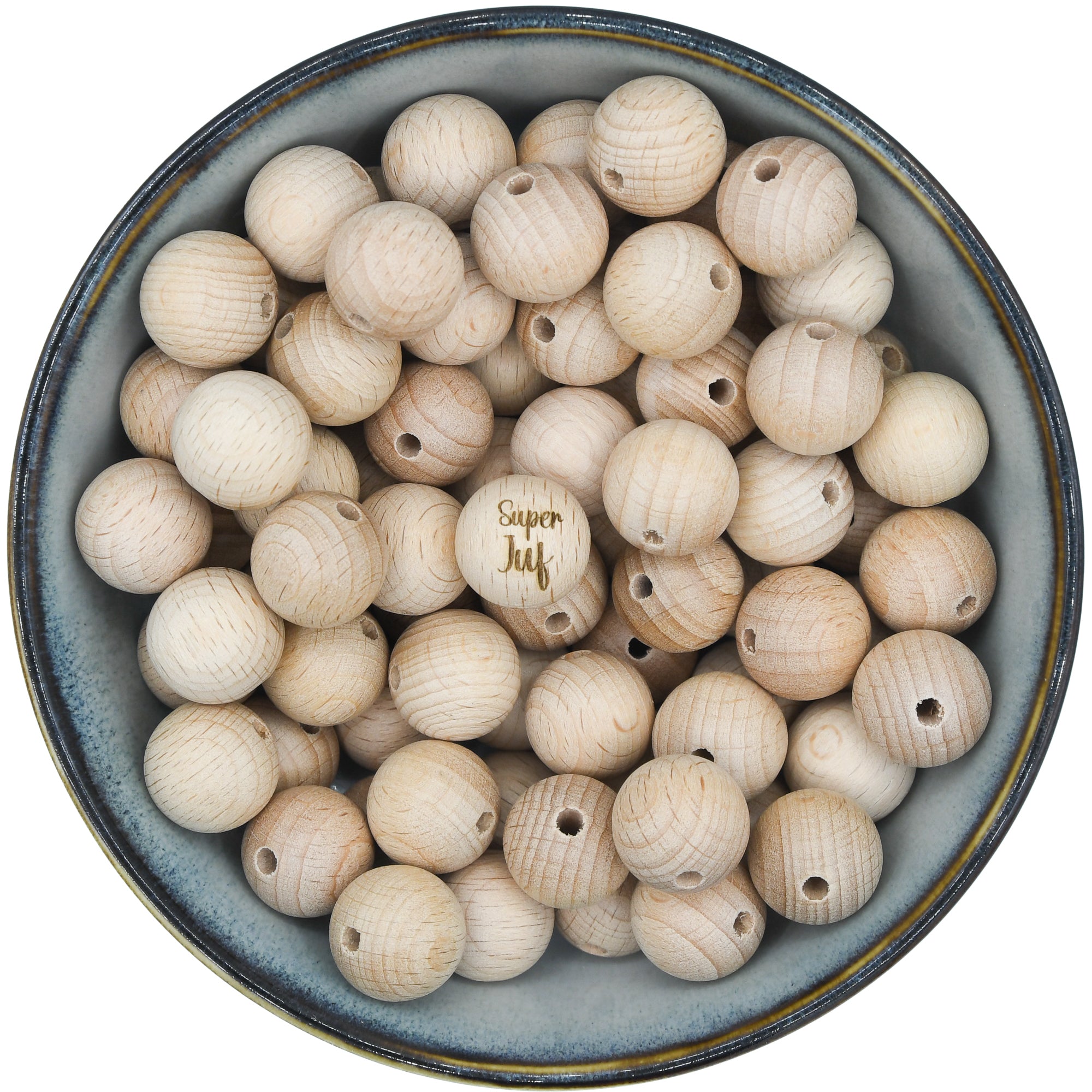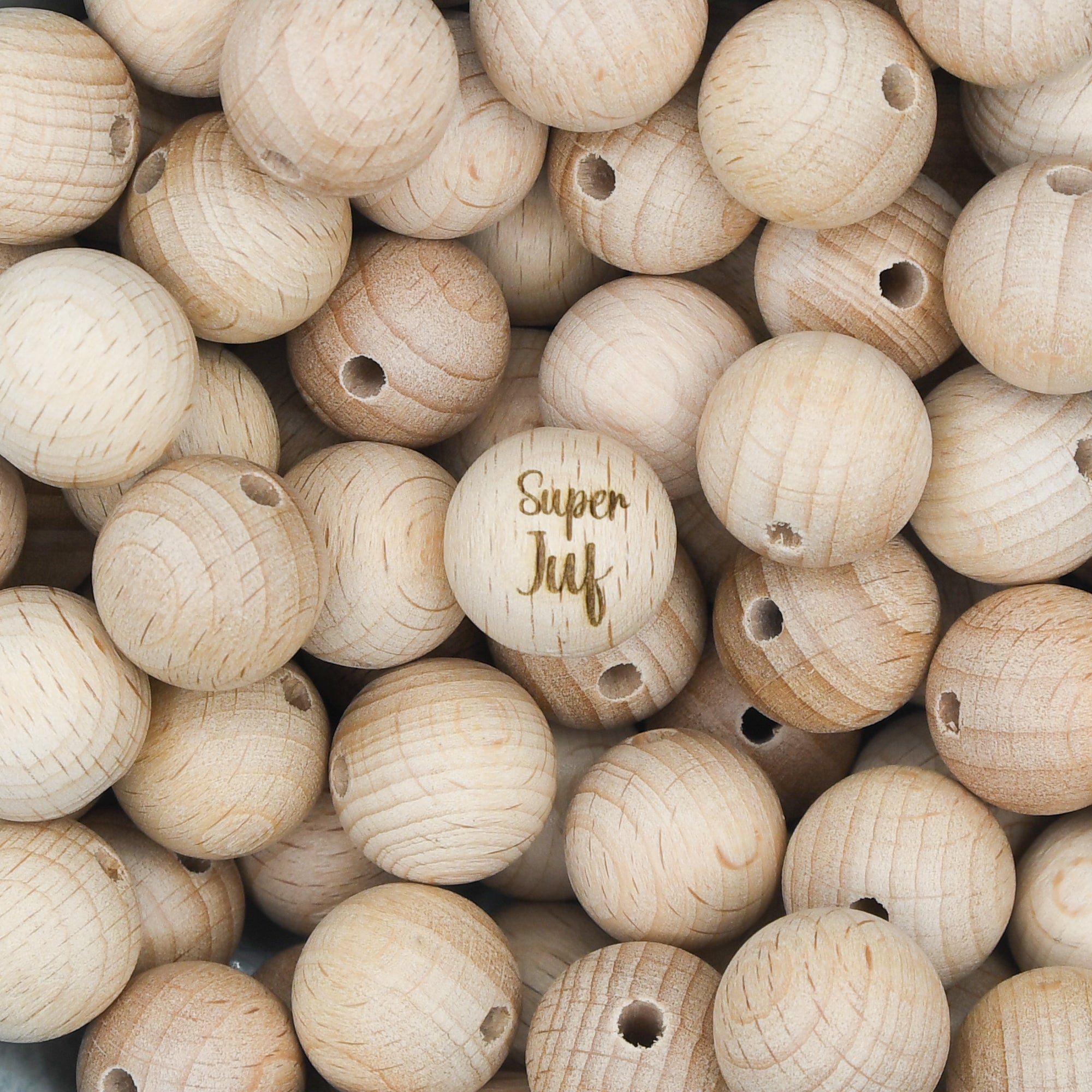 Unprocessed beech wood bead of 18 mm with a lasered text.