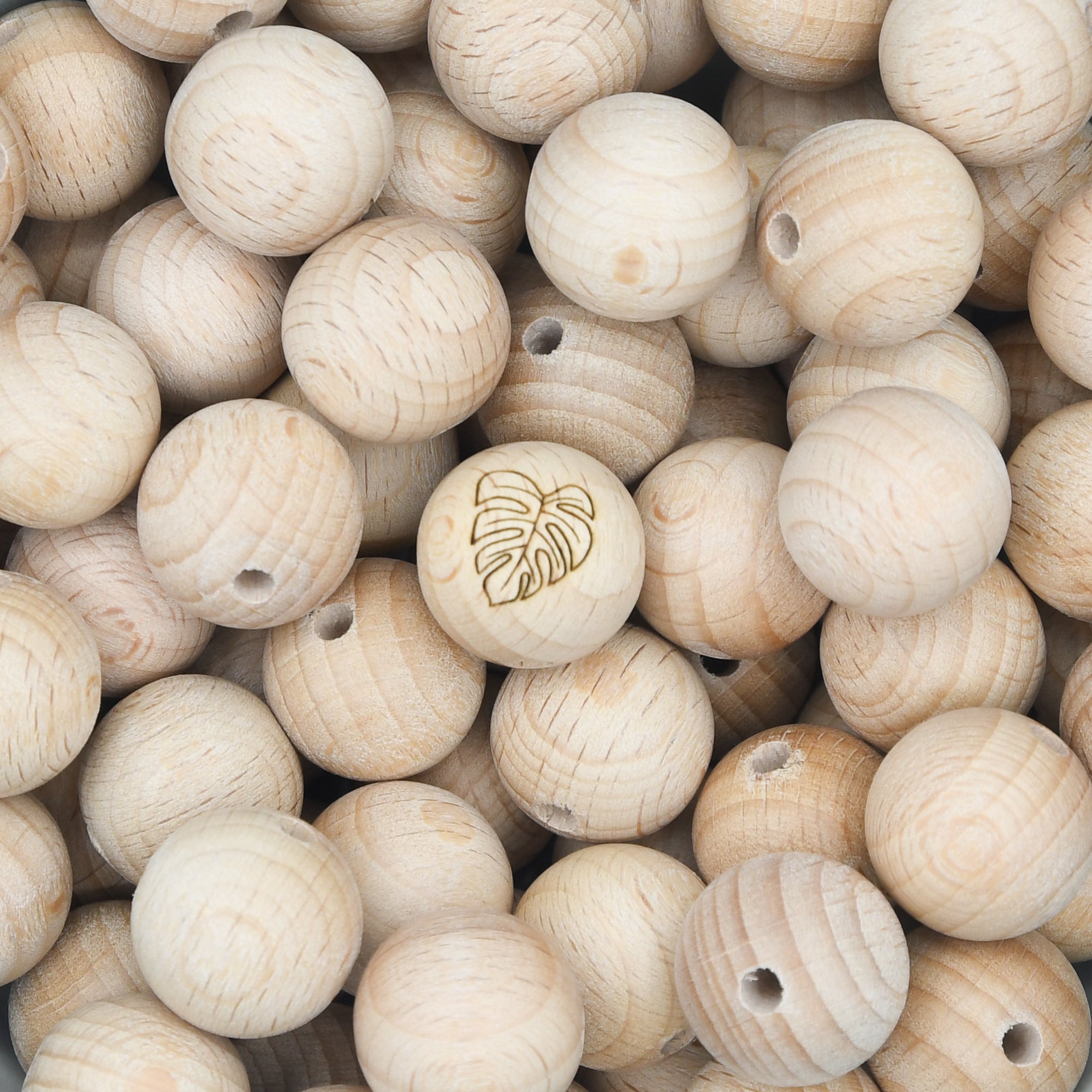 Unprocessed beech wood bead of 18 mm with a lasered image of a monstera leaf.