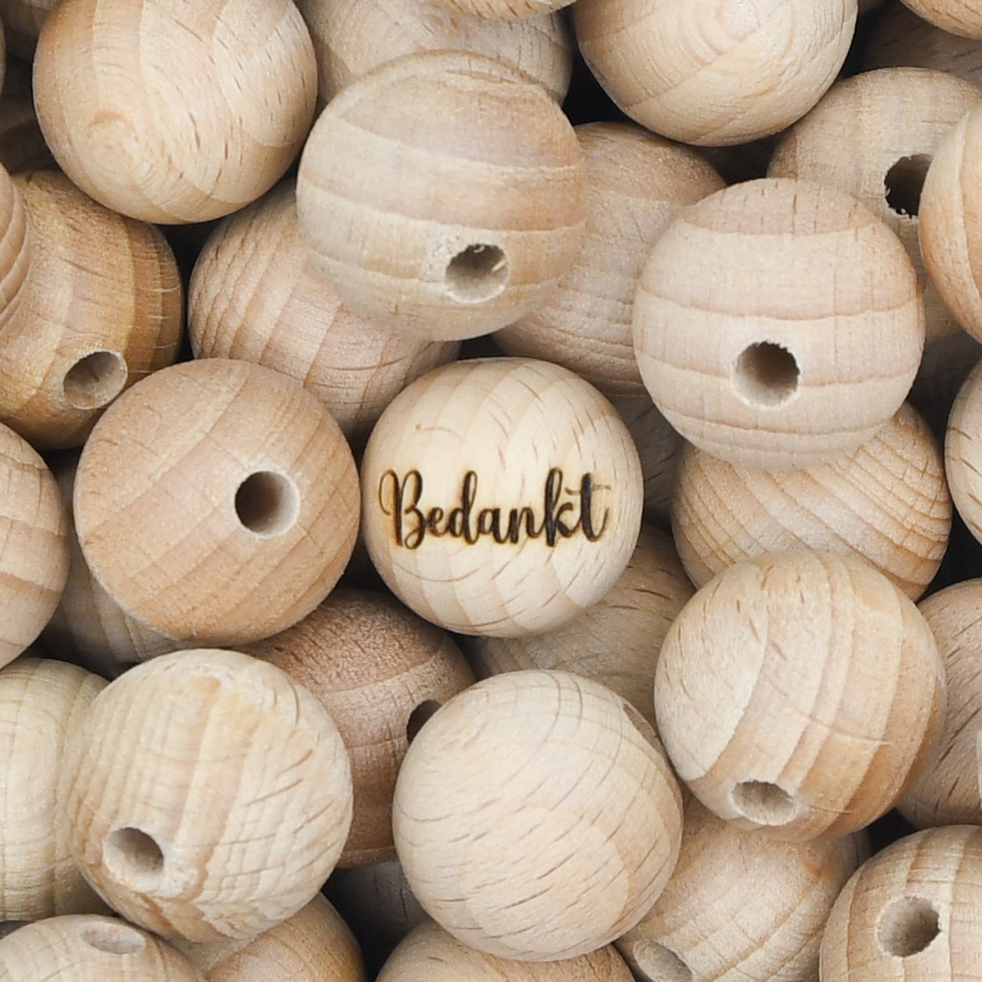 Perle en bois de hêtre non traité de 18 mm avec le texte « Merci » gravé au laser.
