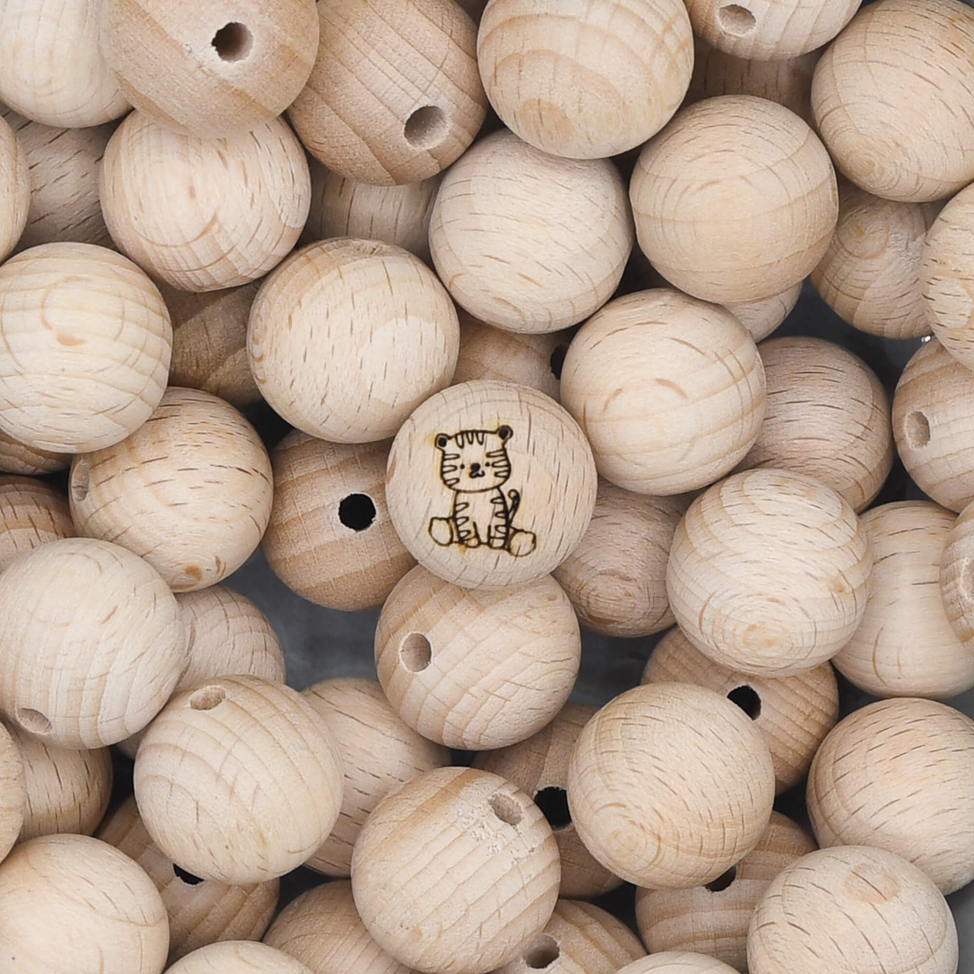 Onbewerkte beukenhouten kraal van 18 mm met een gelaserde afbeelding van een tijgertje.