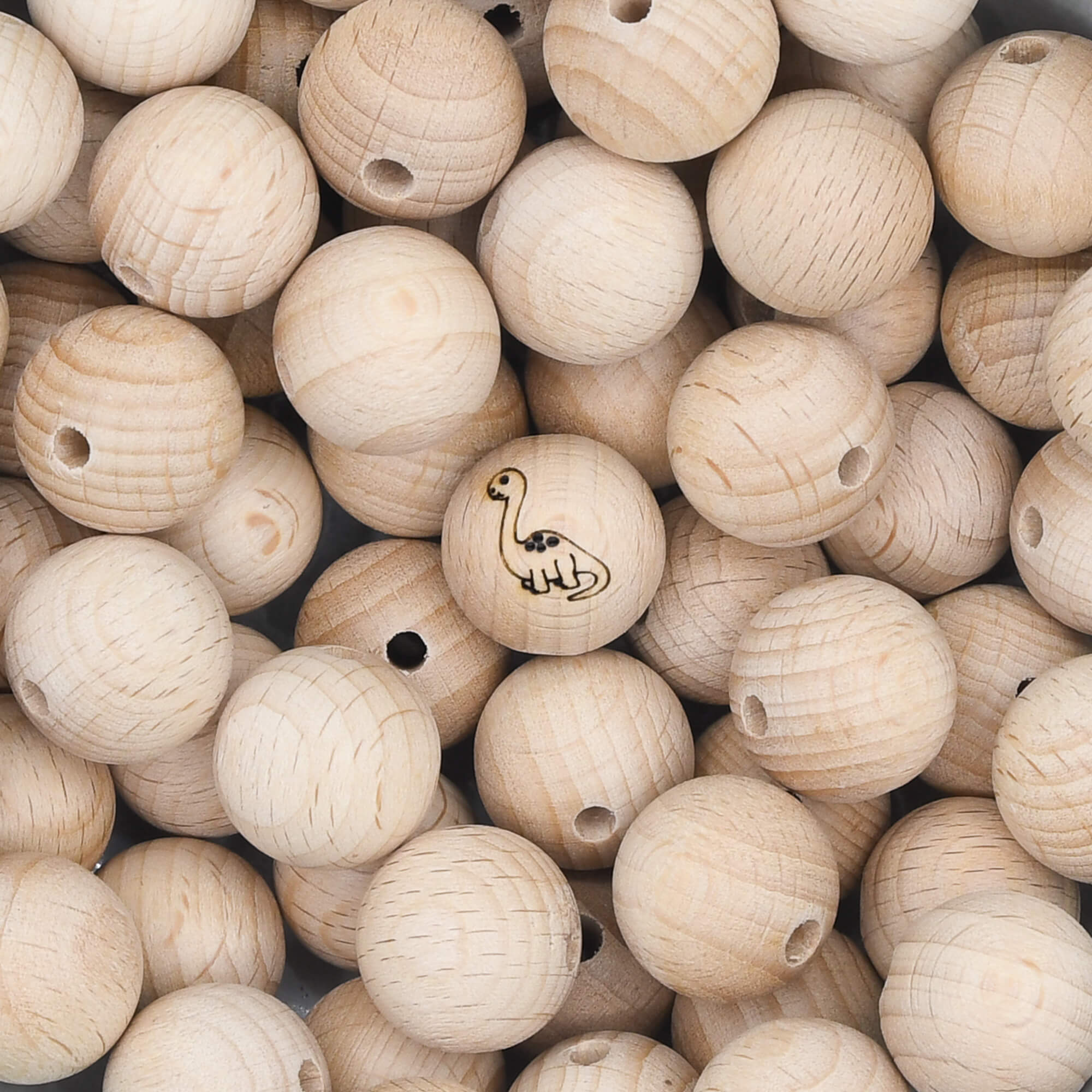 Onbewerkte beukenhouten kraal van 18 mm met een gelaserde afbeelding van een dinosaurus.