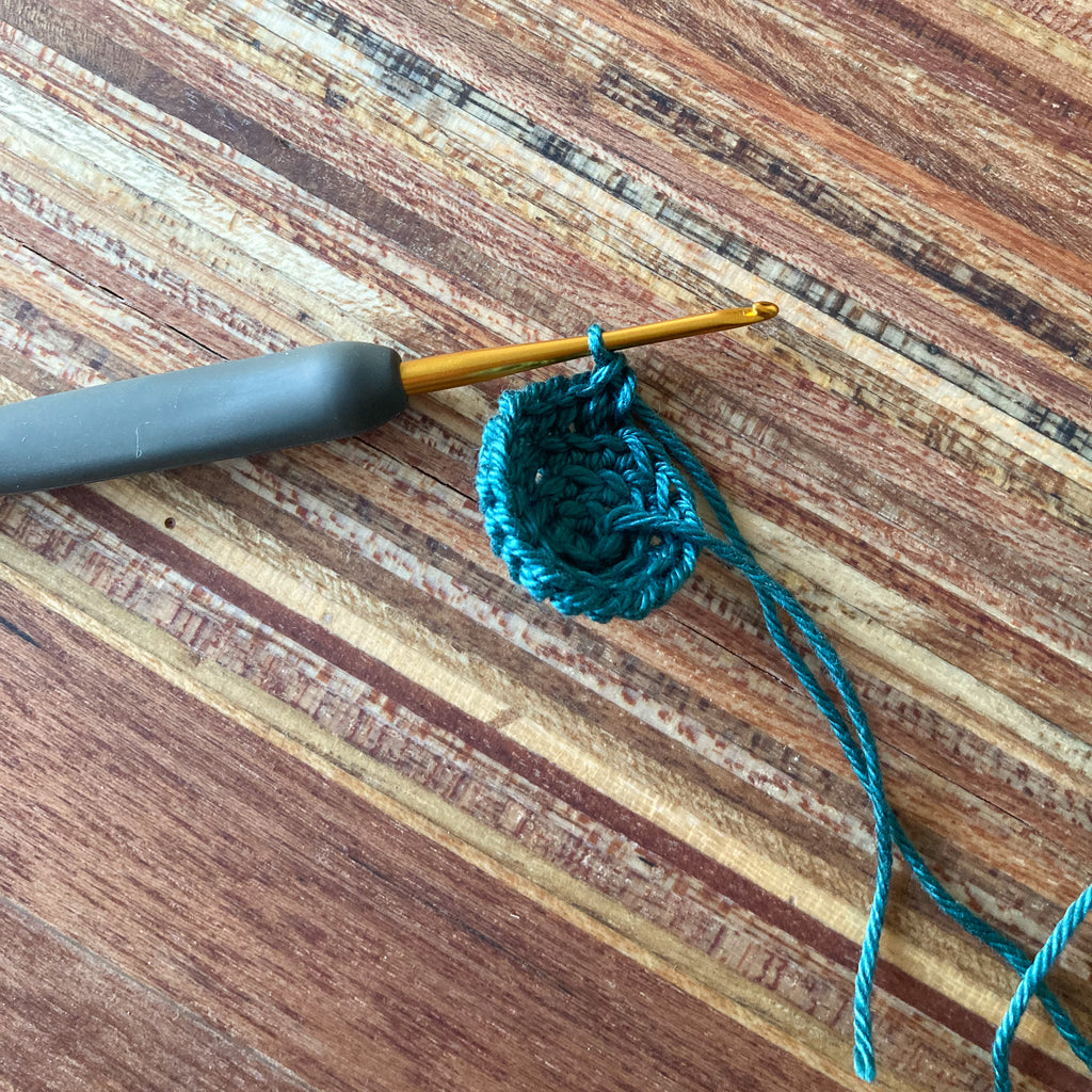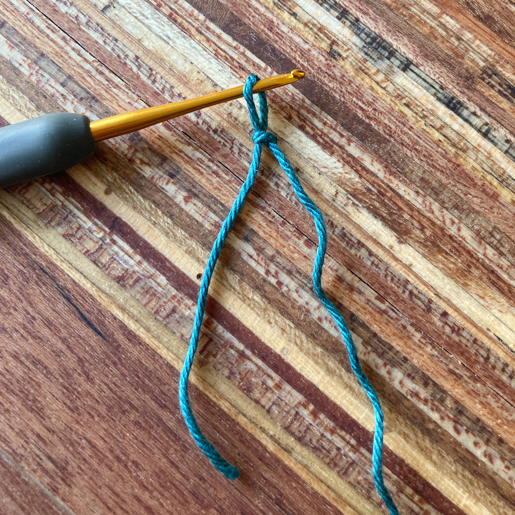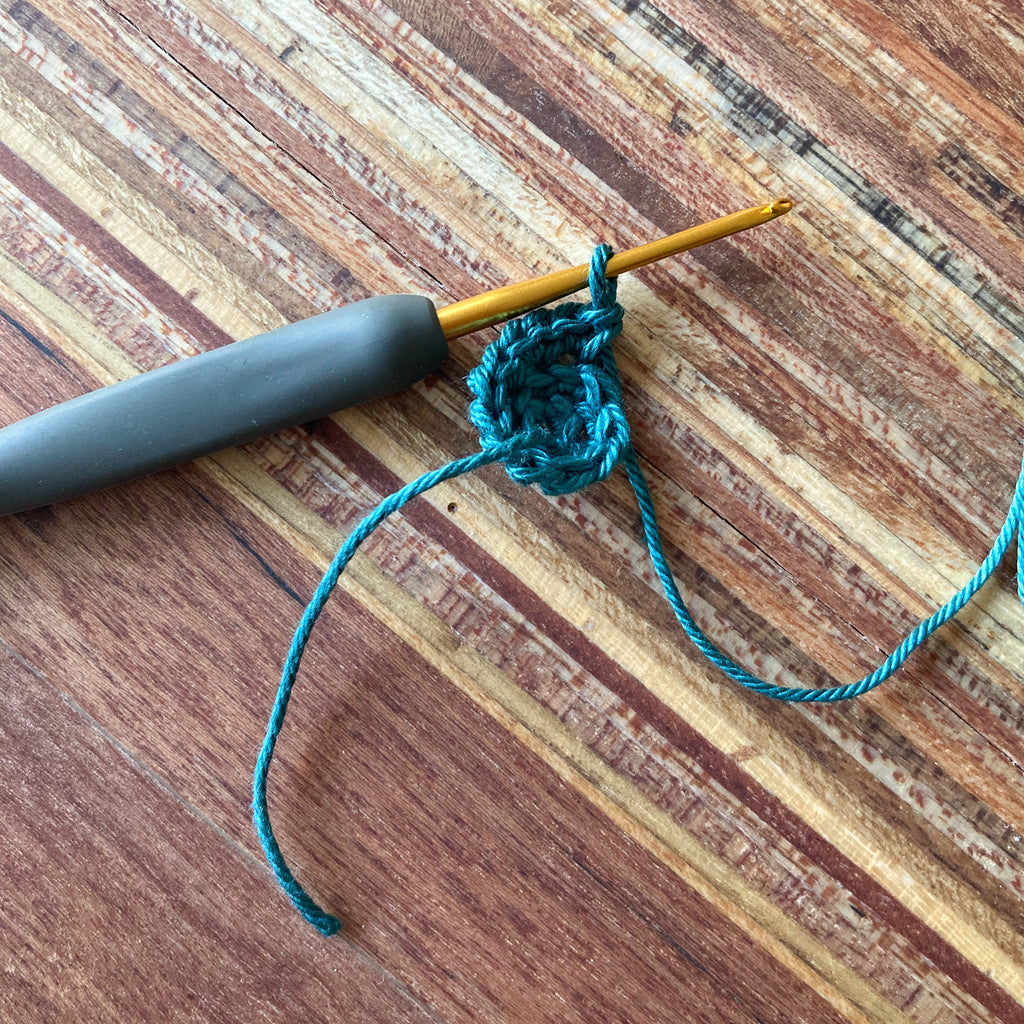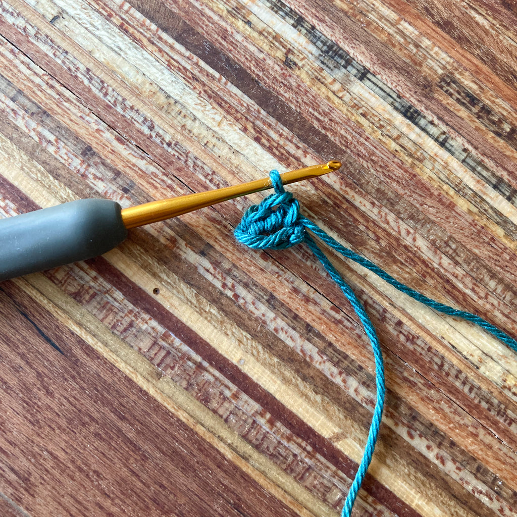 Maak een ruime lus op je haaknaald, en haak 3 vasten op de rand van de lus. Trek de lus iets aan, maar niet te strak. Anders raak je het gat in de kraal kwijt. (Voor de haaksters onder jullie: dat is de reden dat ik ervoor kies om niet met een magische ring te beginnen).
