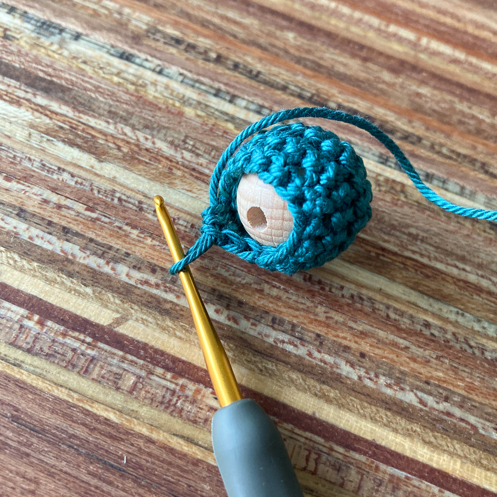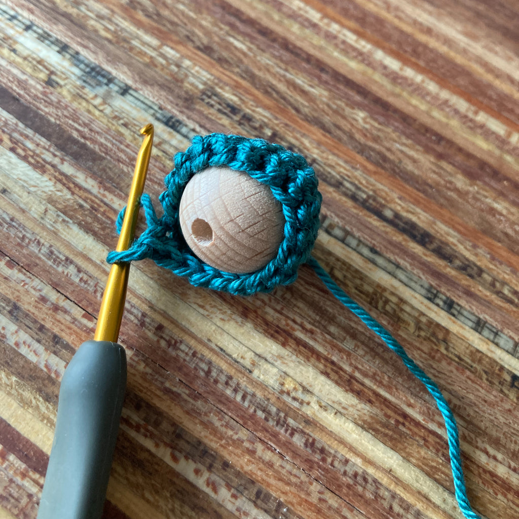 Blijf rondjes haken. Je maakt als het ware een mutsje voor je houten kraal.