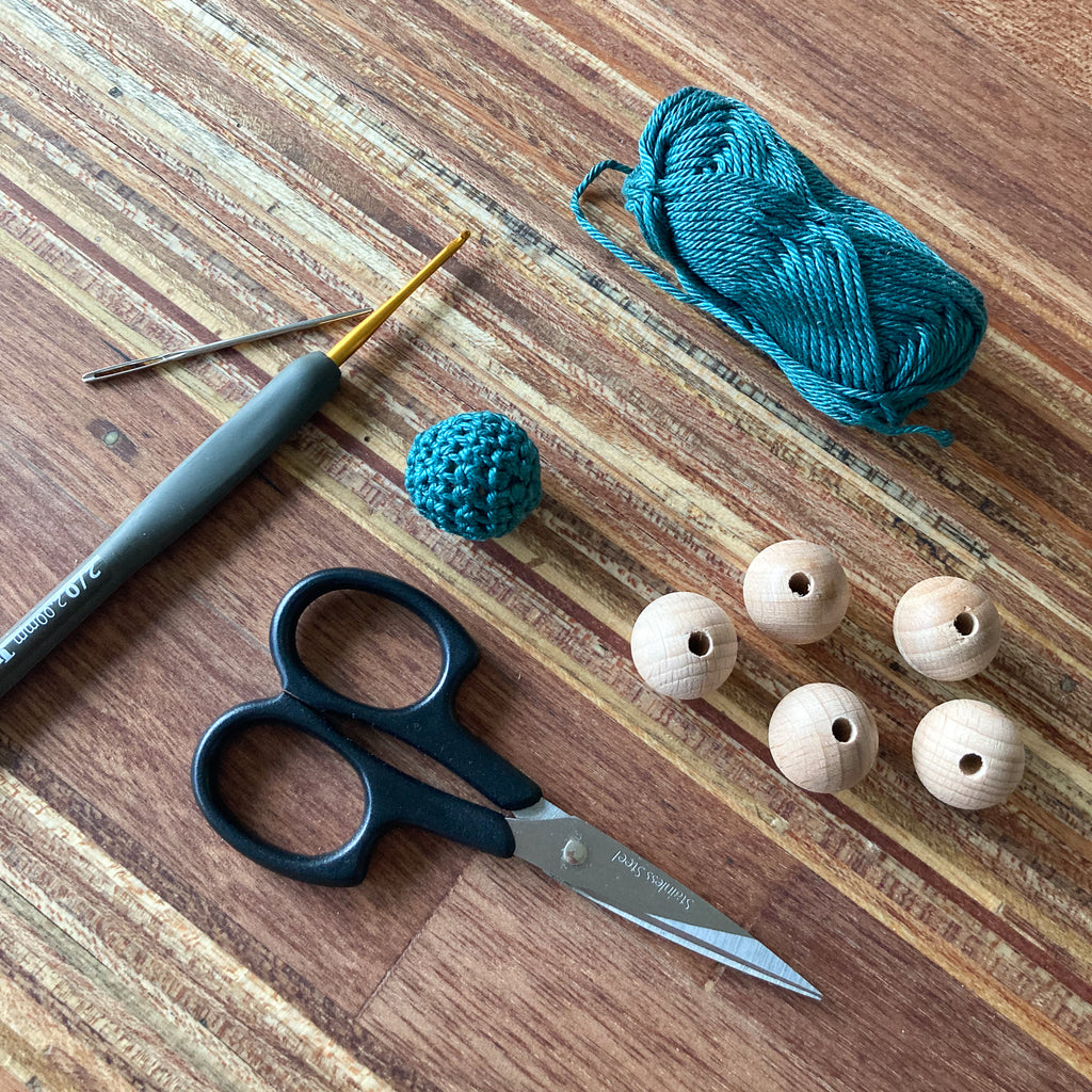 Houten kralen van 18 mm, Haakkatoen, een haaknaald van 2 mm en een rijgnaald.