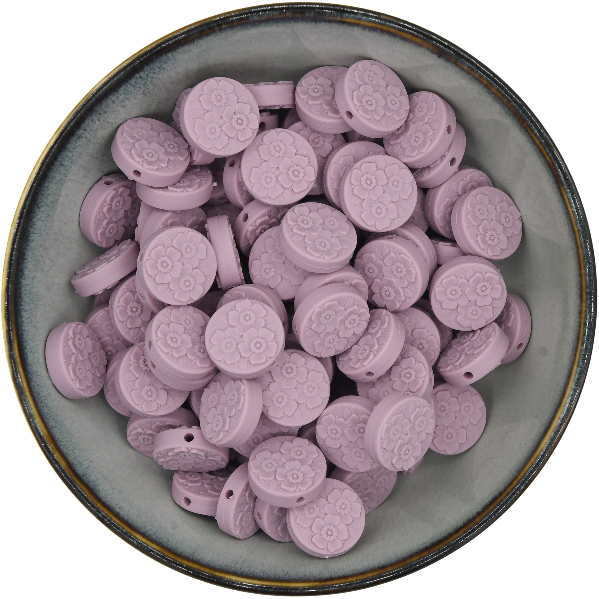 Geweldige kralen om bijvoorbeeld in een speenkoord of sleutelhanger te gebruiken! Platte siliconen schijfjes met aan beide zijden een mooie bloemenstructuur.