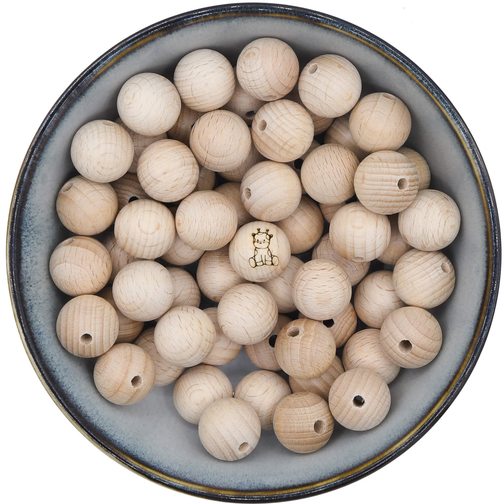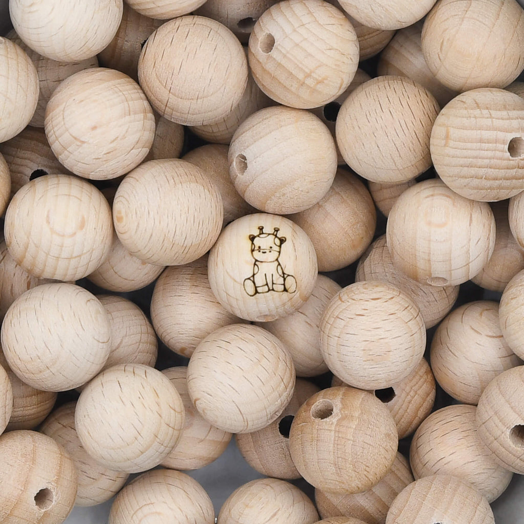 Onbewerkte beukenhouten kraal van 18 mm met een gelaserde afbeelding van een girafje.