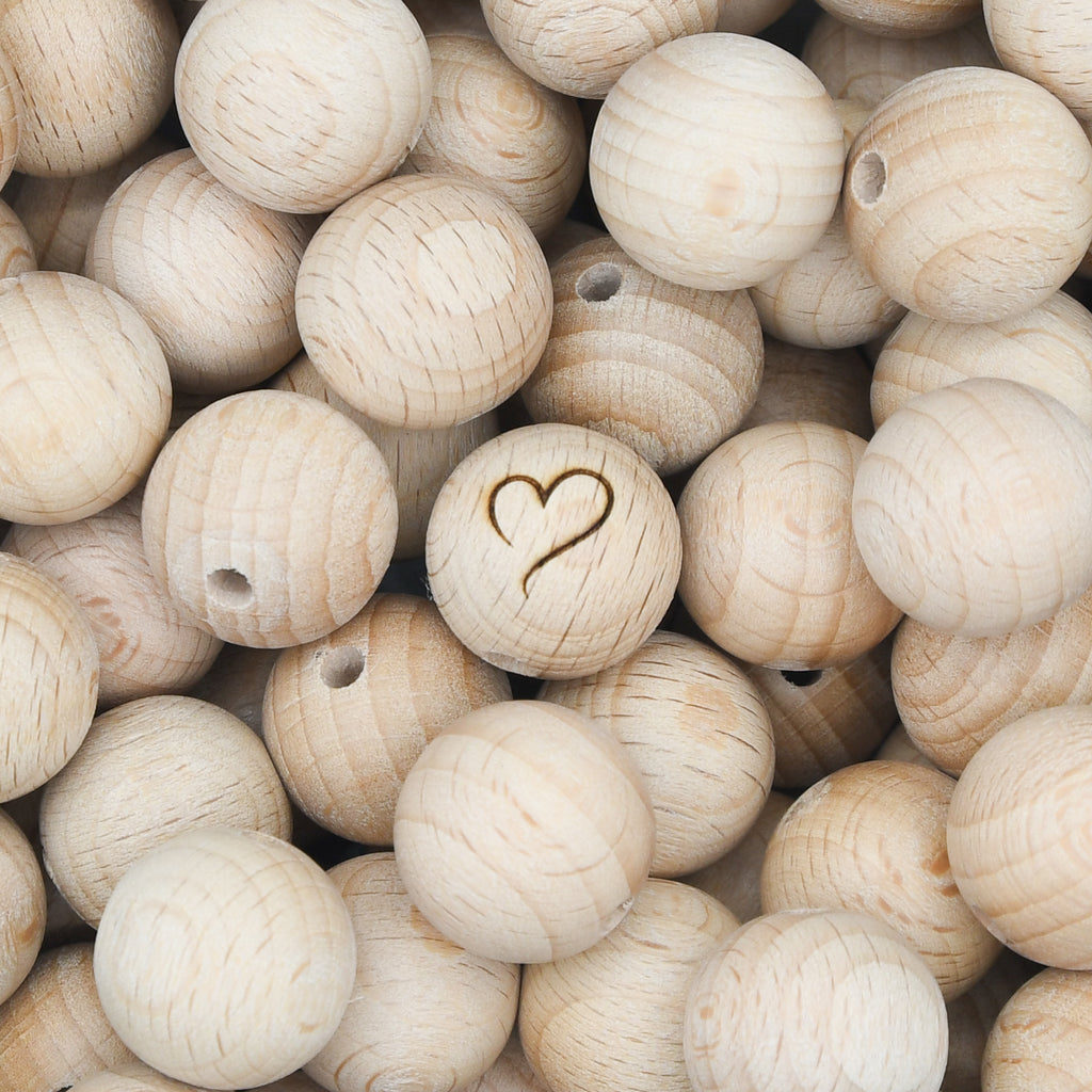 Onbewerkte beukenhouten kraal van 18 mm met een gelaserde afbeelding van een stijlvol hart.