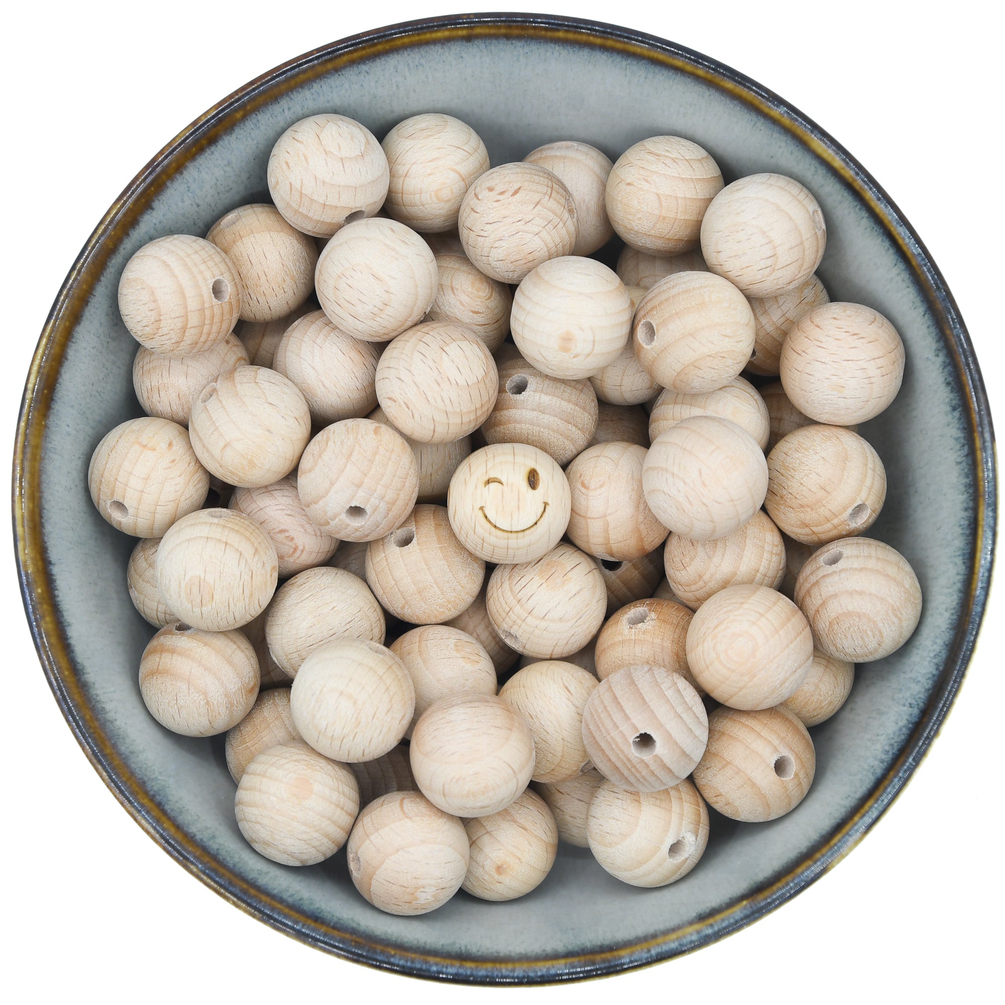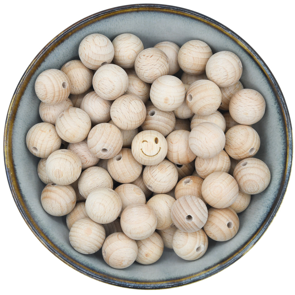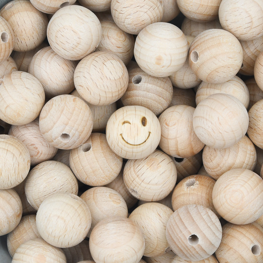 Onbewerkte beukenhouten kraal van 18 mm met een gelaserde afbeelding van een knipogende smiley.