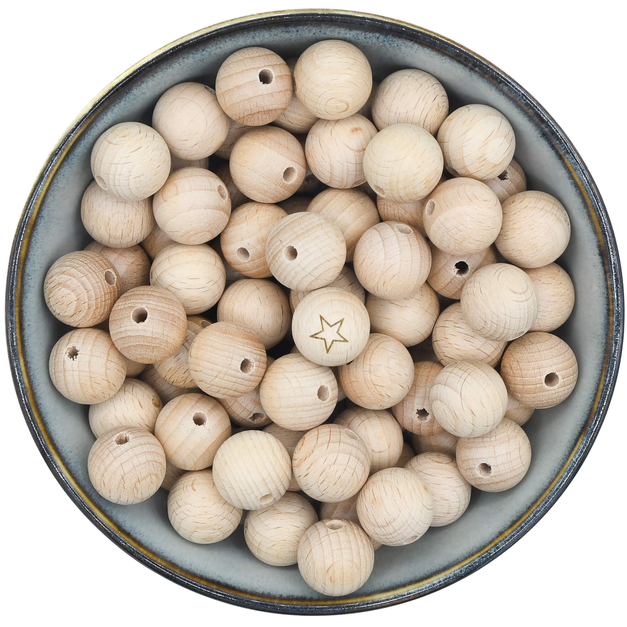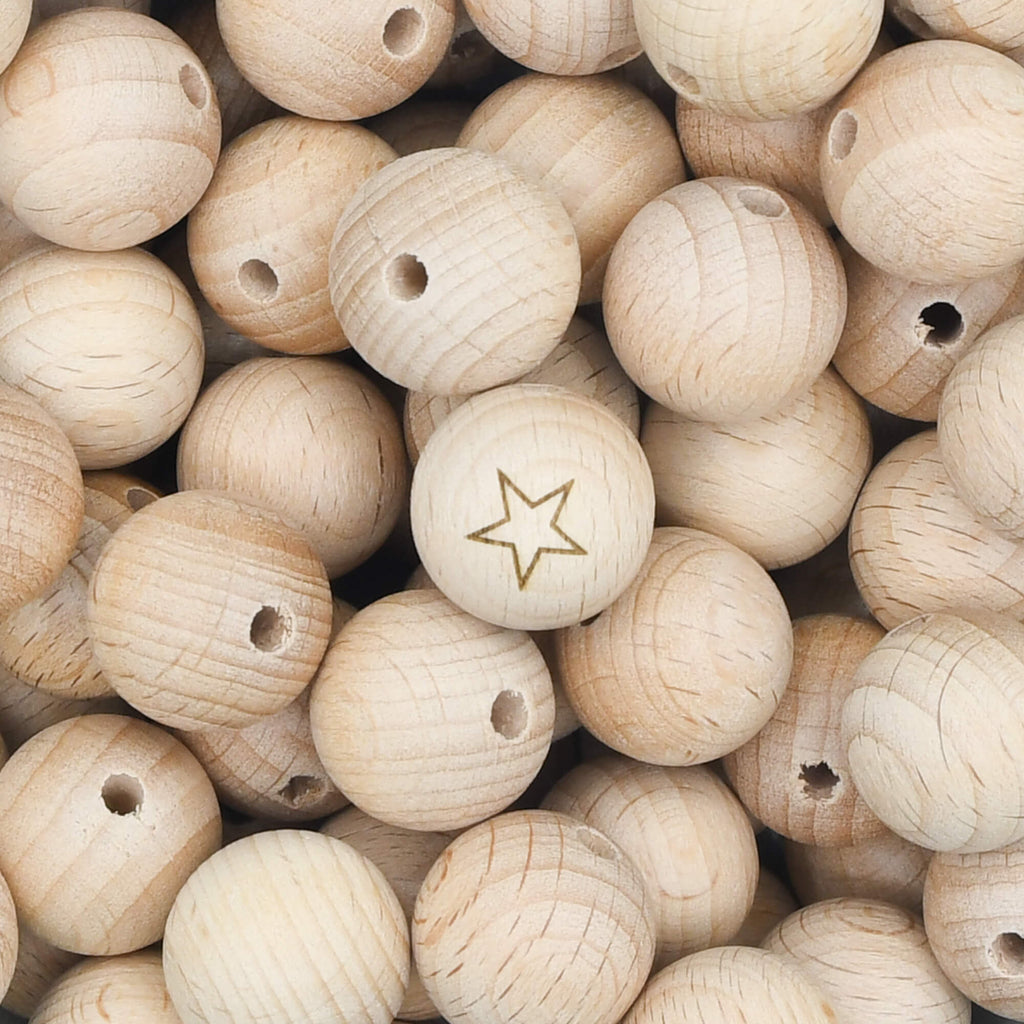 Onbewerkte beukenhouten kraal van 18 mm met een gelaserde afbeelding van een ster.