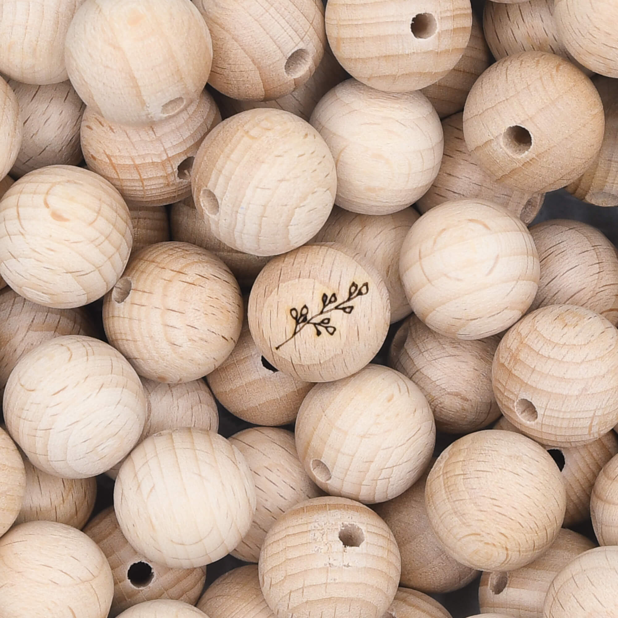 Onbewerkte beukenhouten kraal van 18 mm met een gelaserde afbeelding van een takje met bladeren.