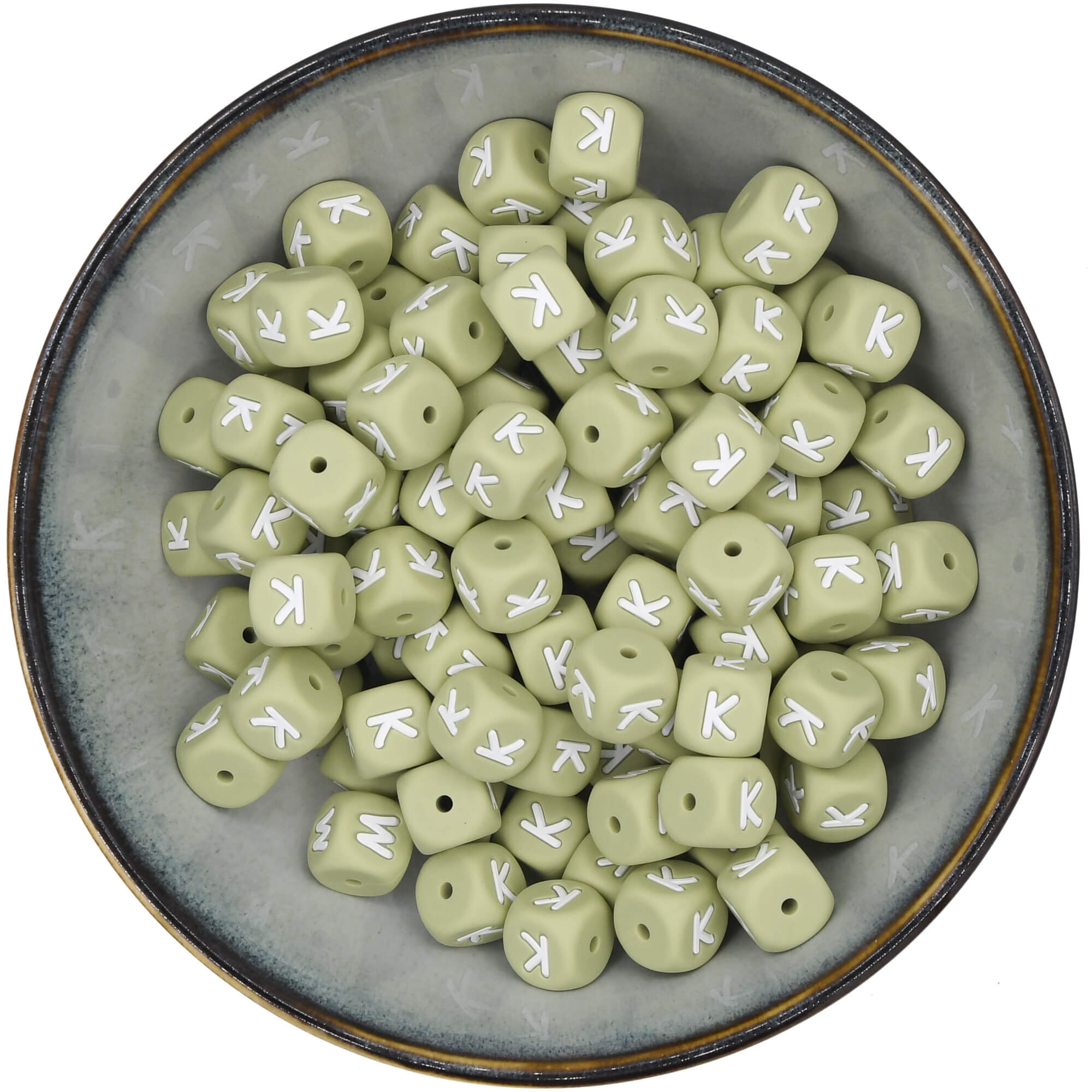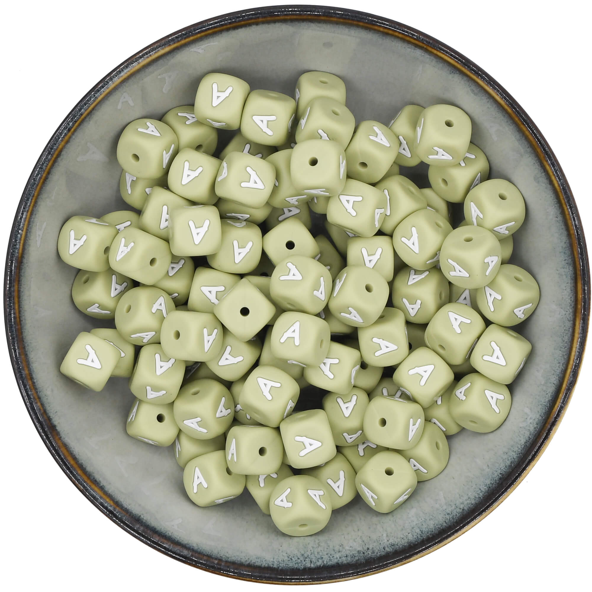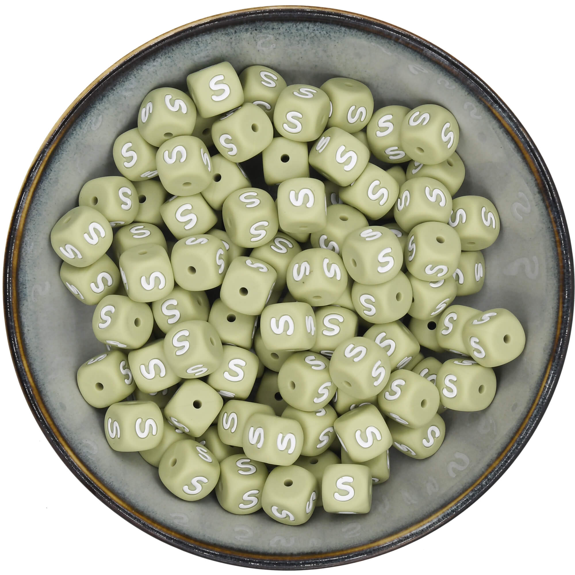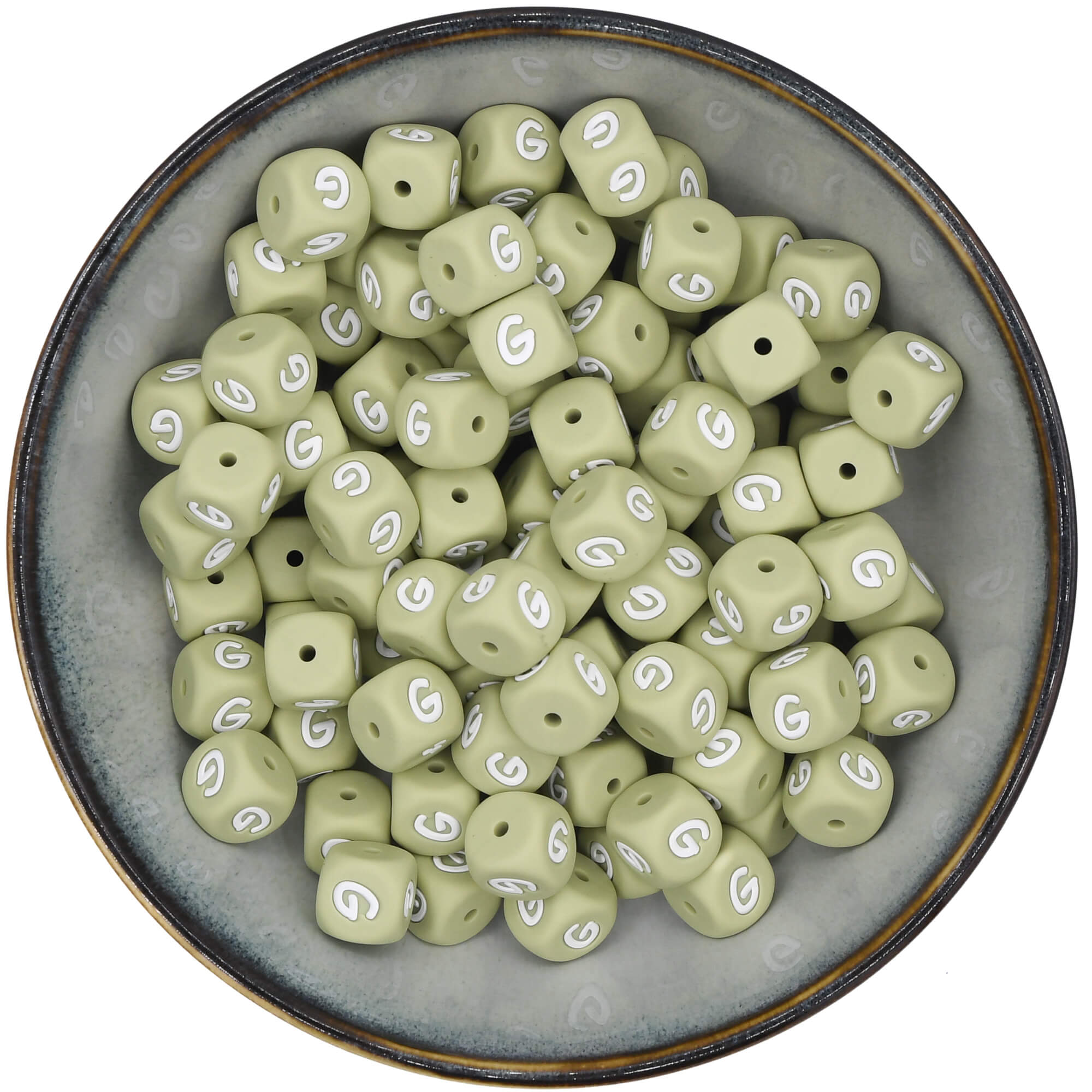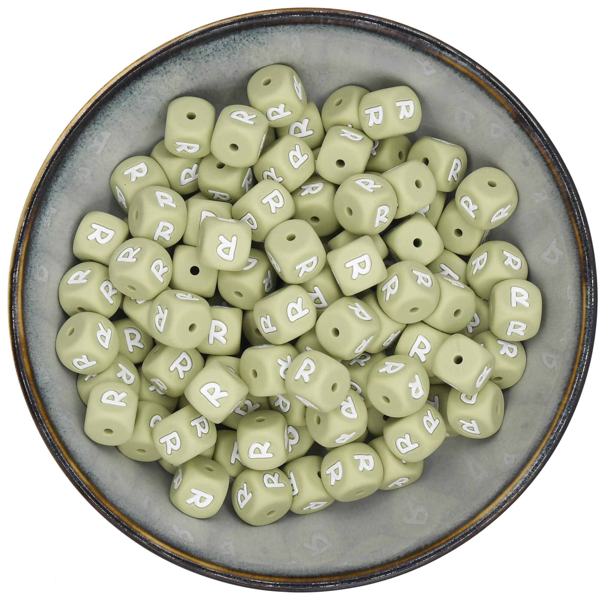 Letterkralen van 12 mm in een vergrijsd groene kleur die sterk lijkt op mijn andere vergrijsd groene kralen.
