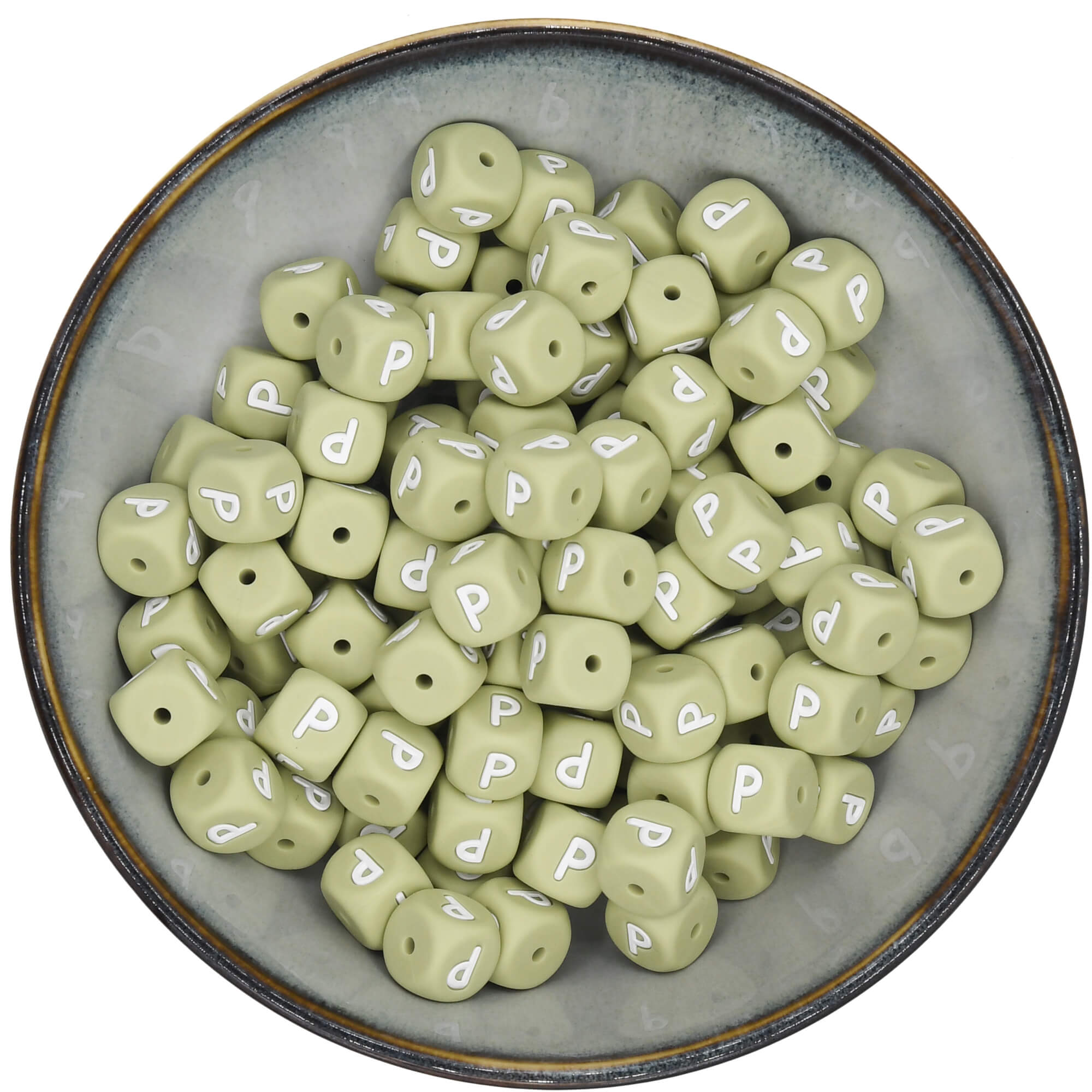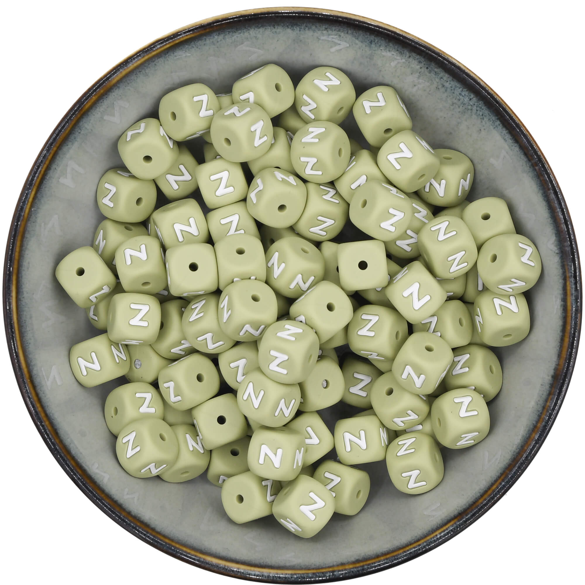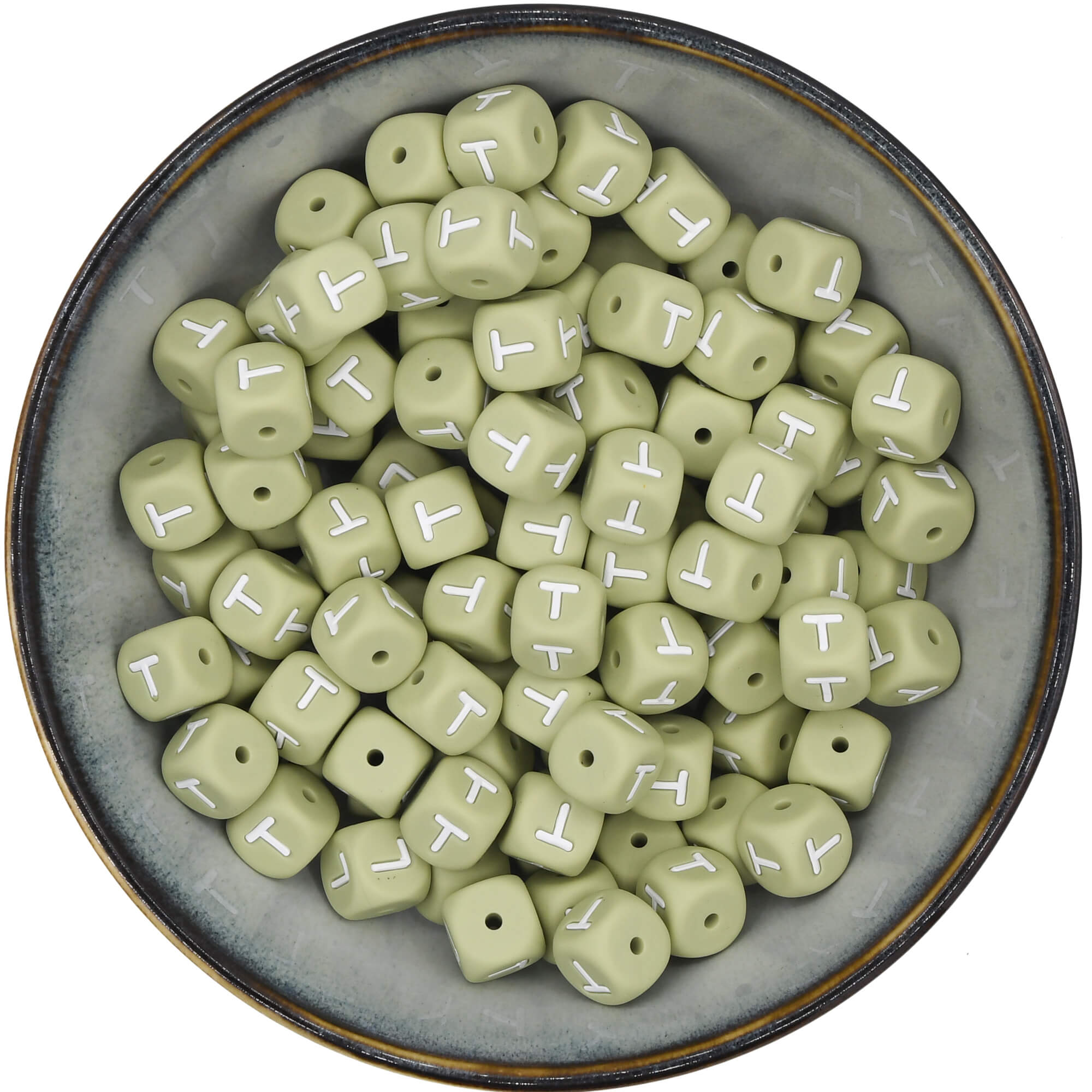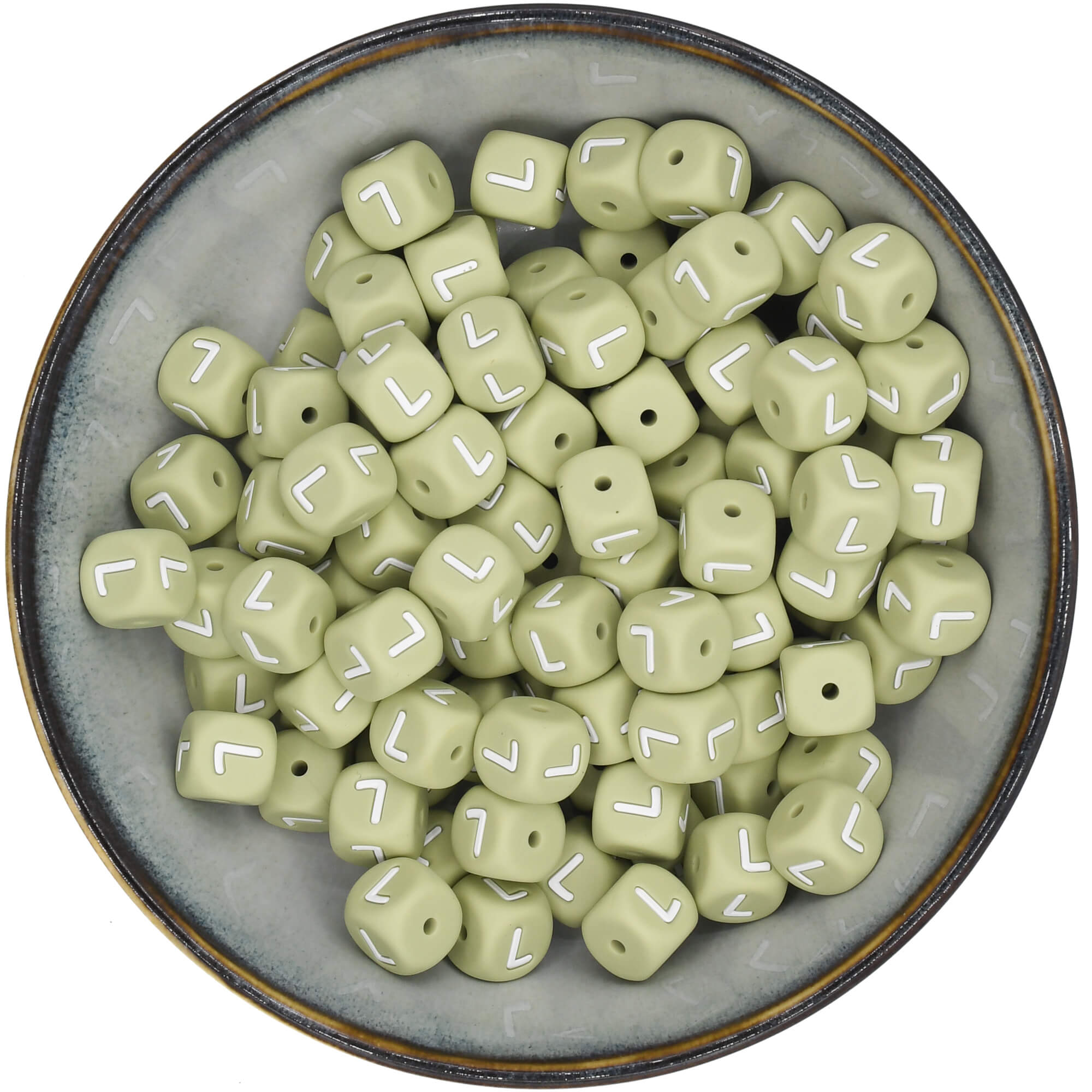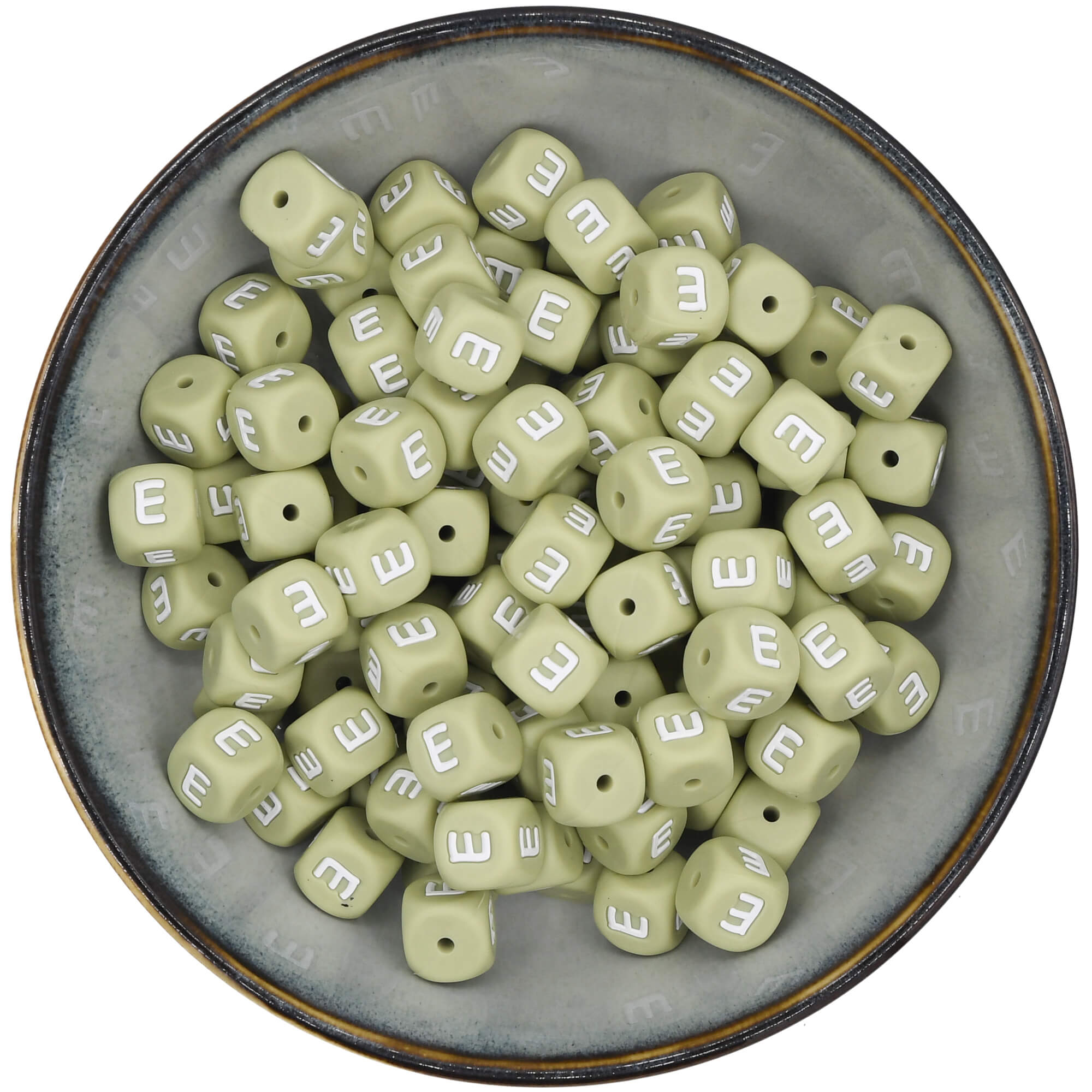 Letterkralen van 12 mm in een vergrijsd groene kleur die sterk lijkt op mijn andere vergrijsd groene kralen.