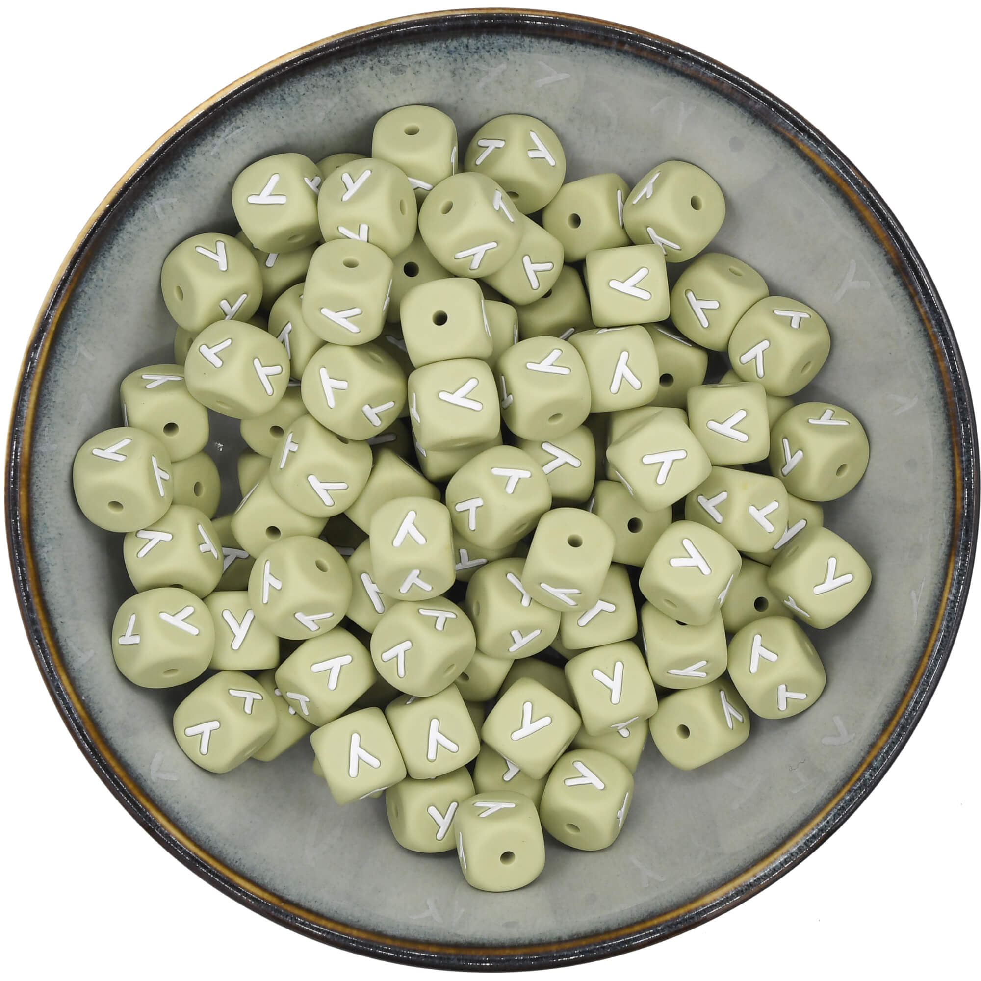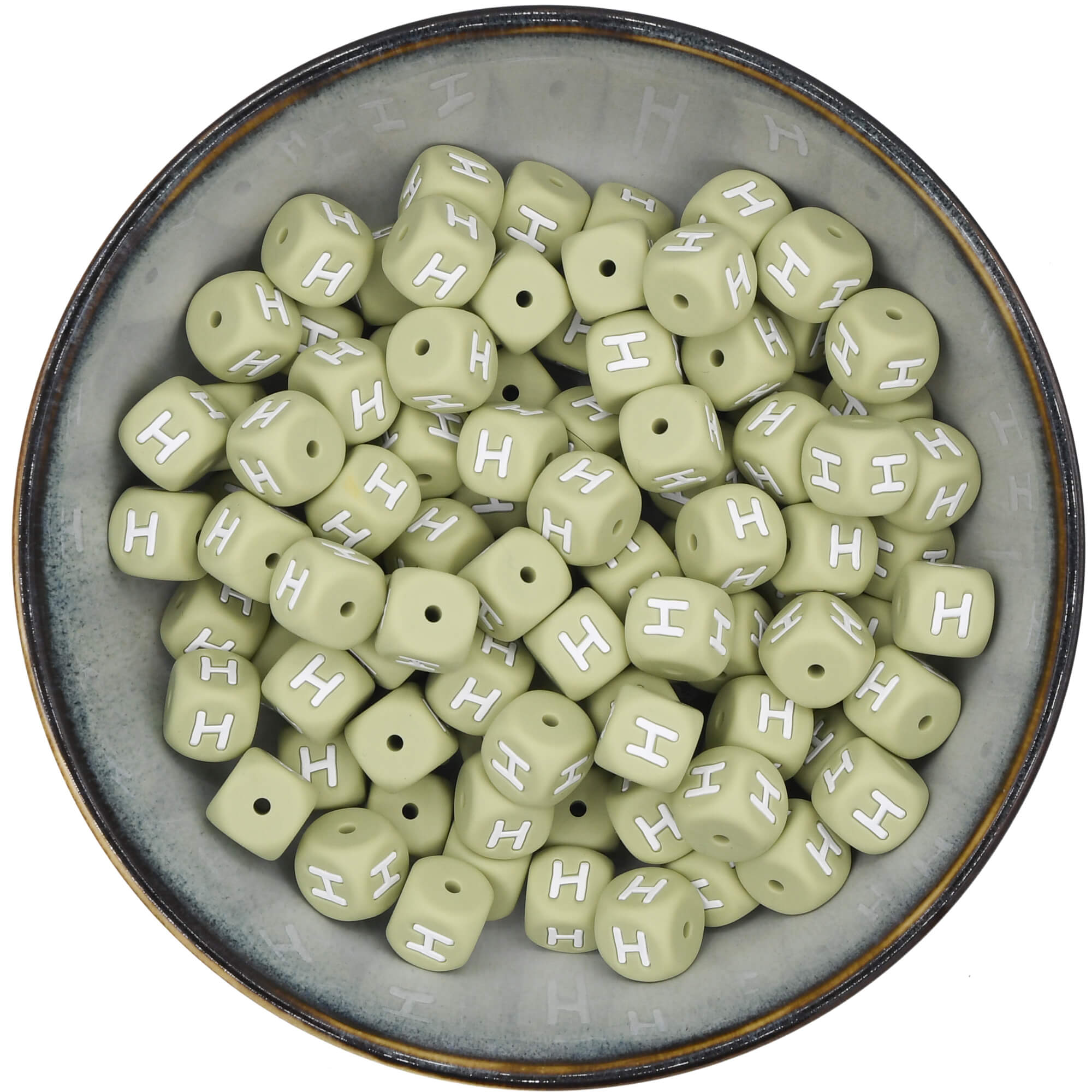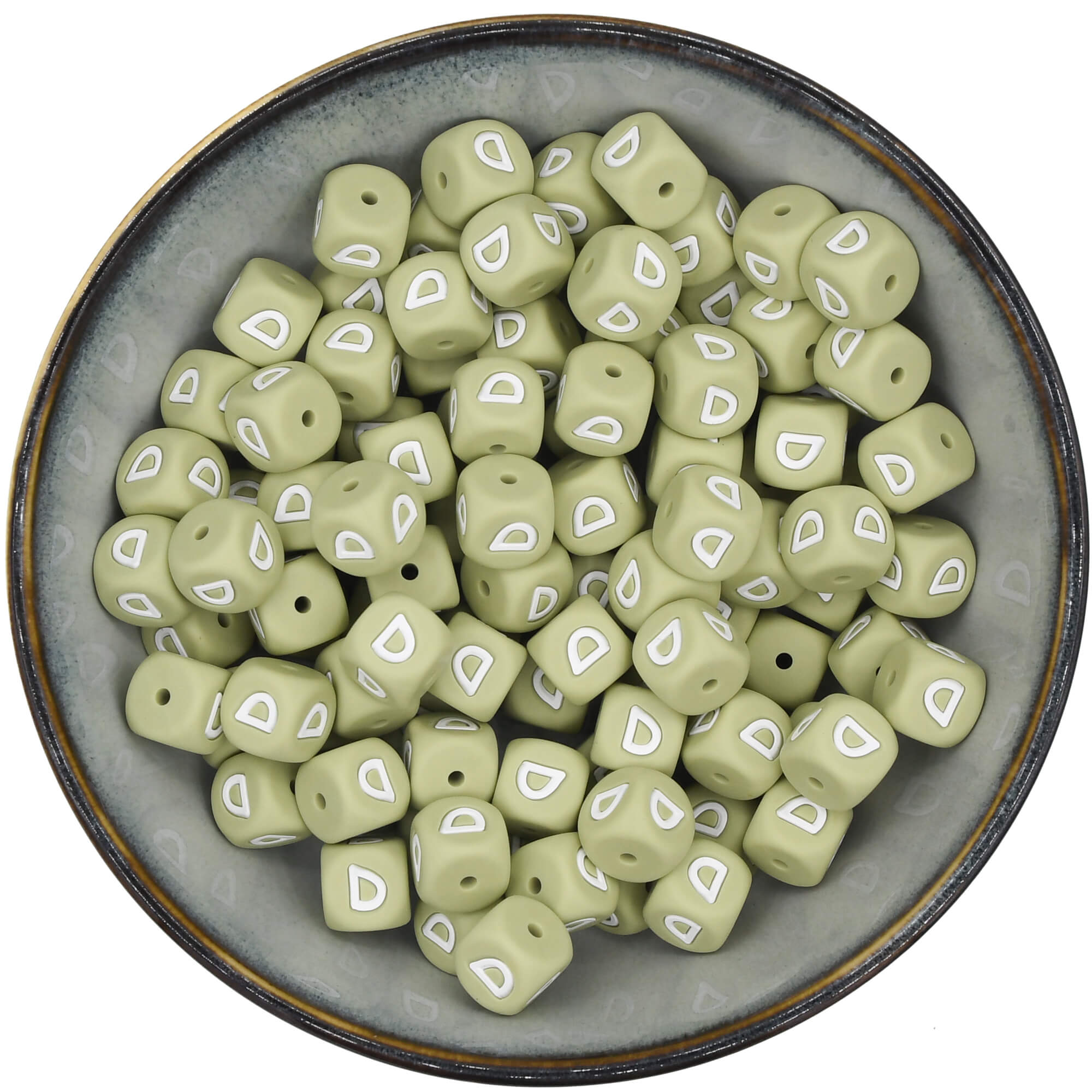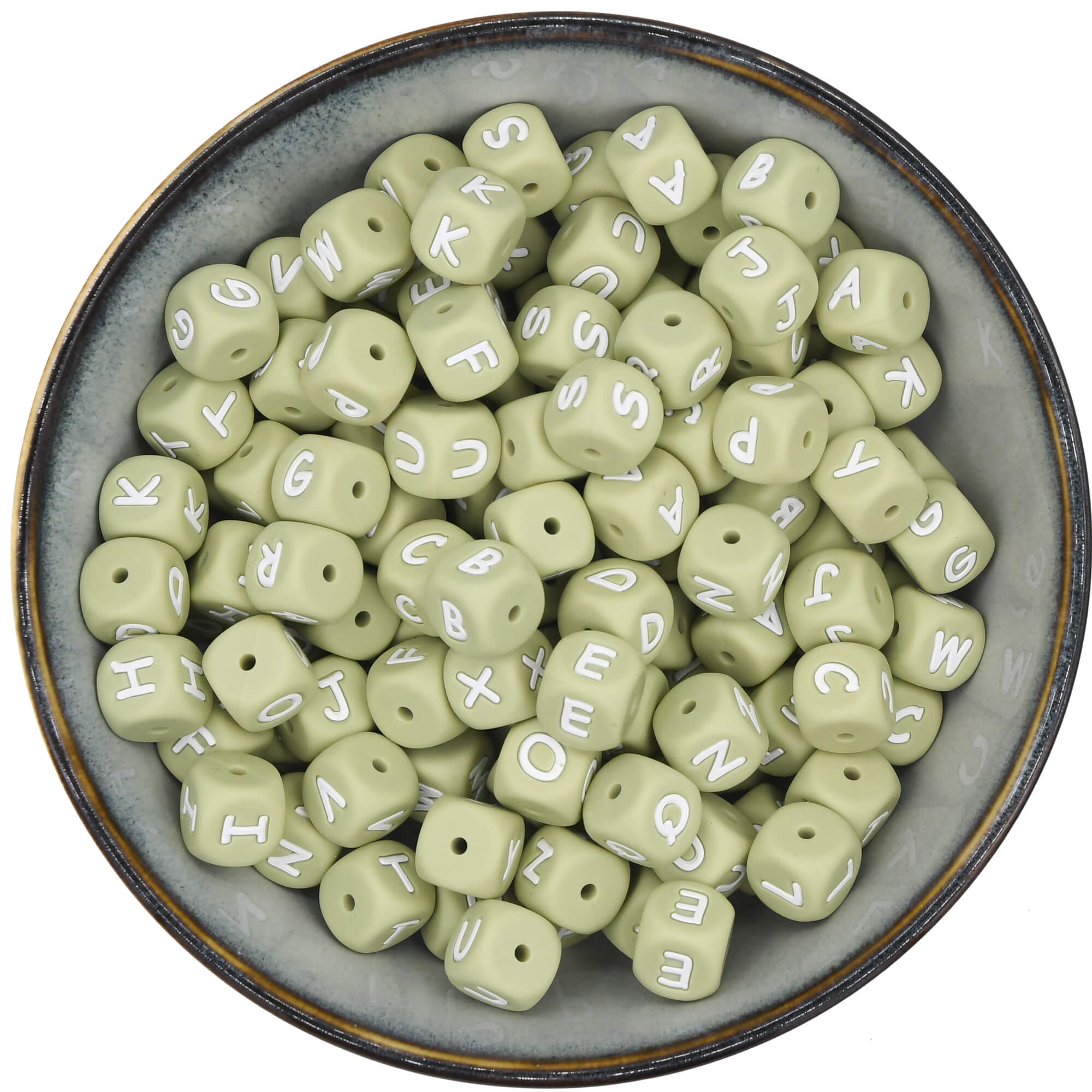 Letterkralen van 12 mm in een vergrijsd groene kleur die sterk lijkt op mijn andere vergrijsd groene kralen.
