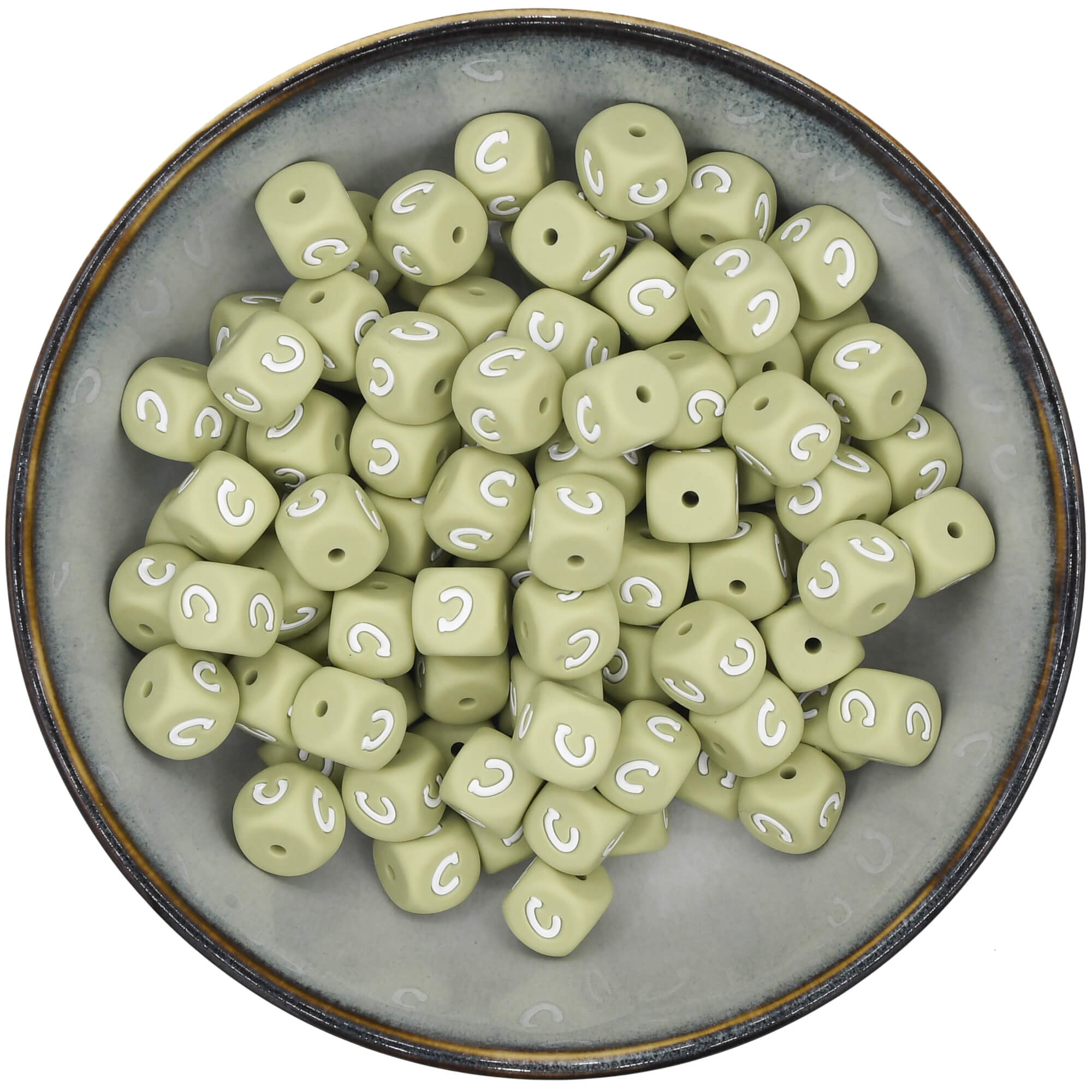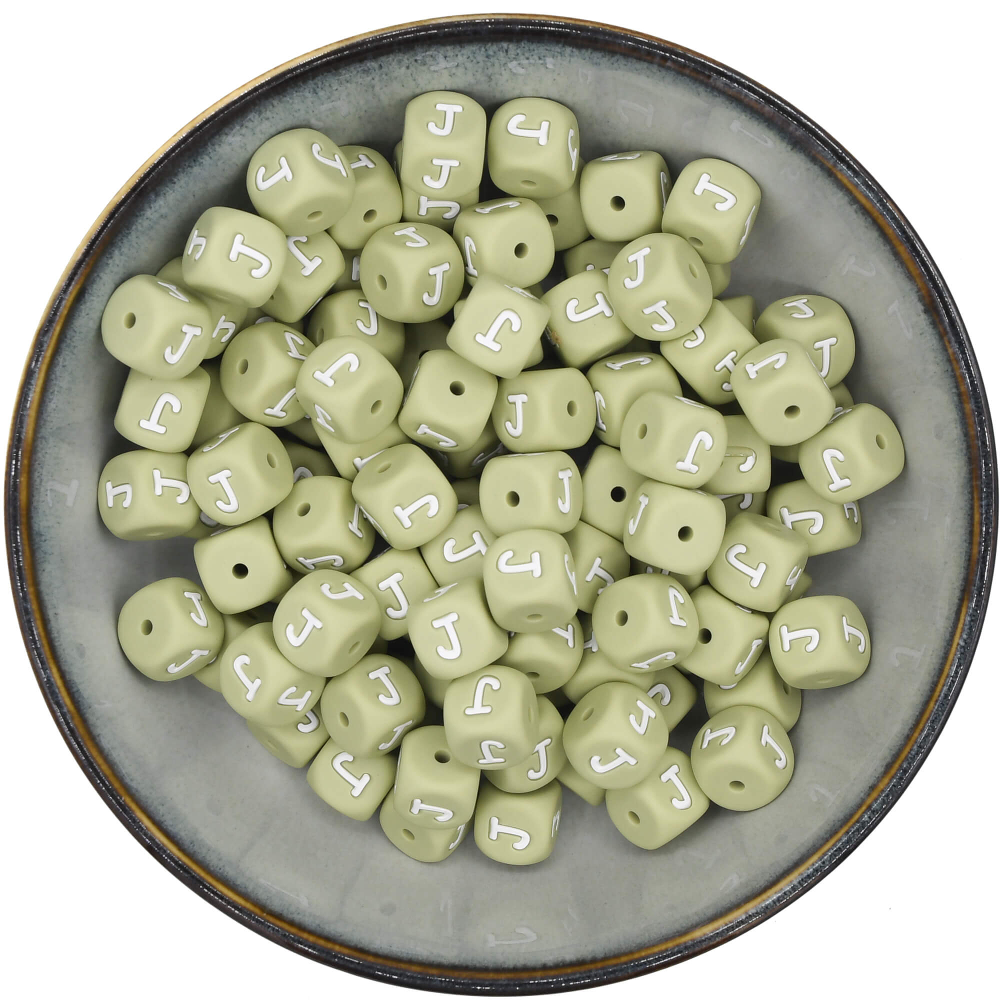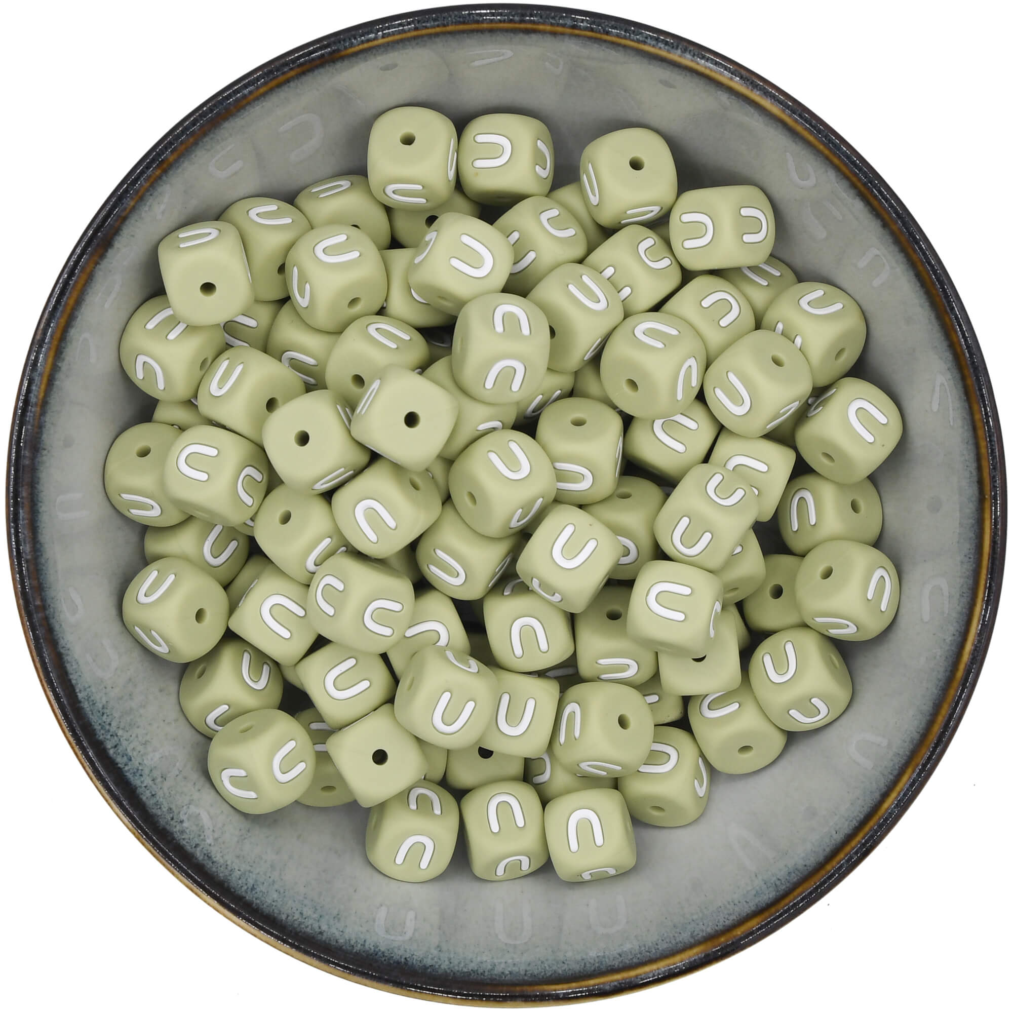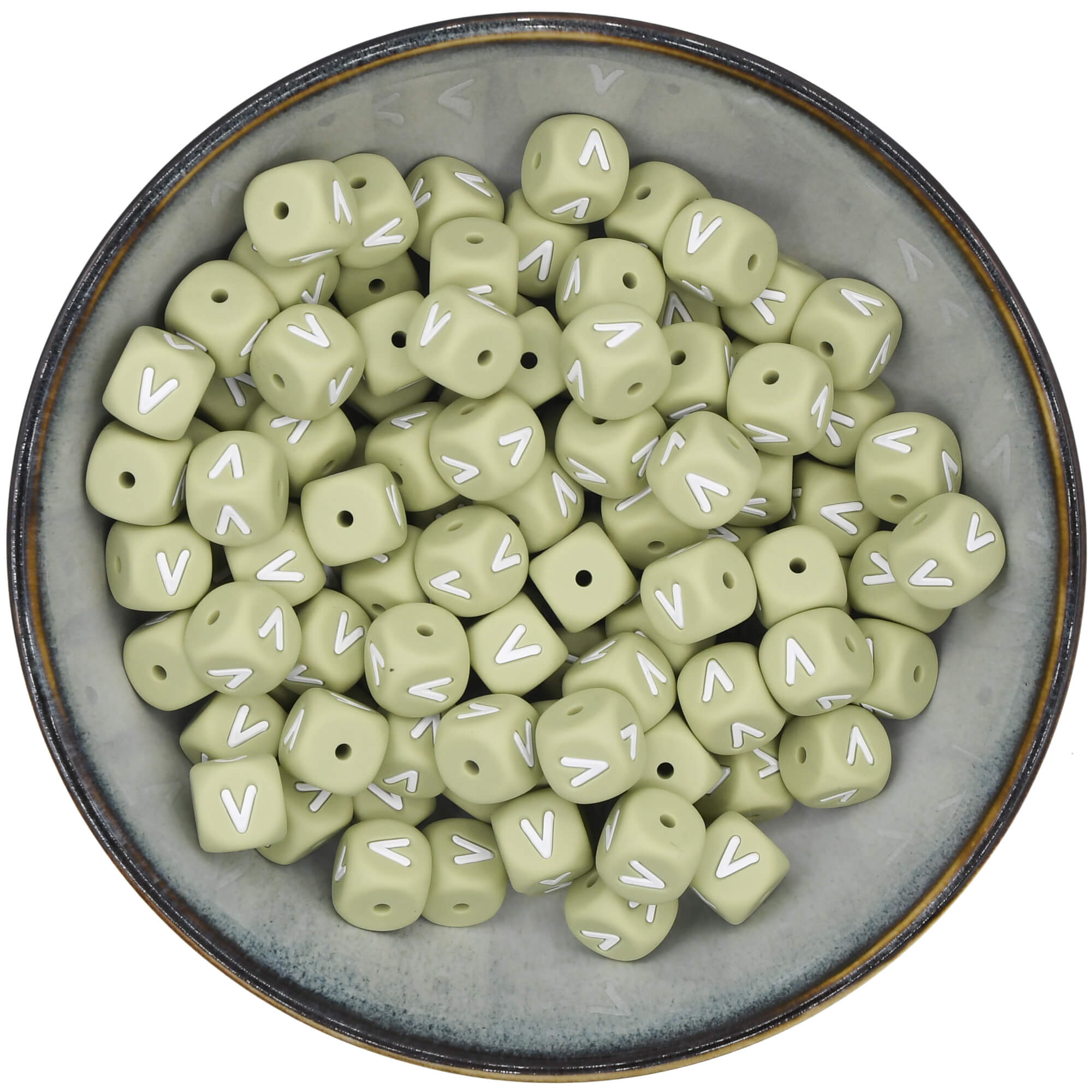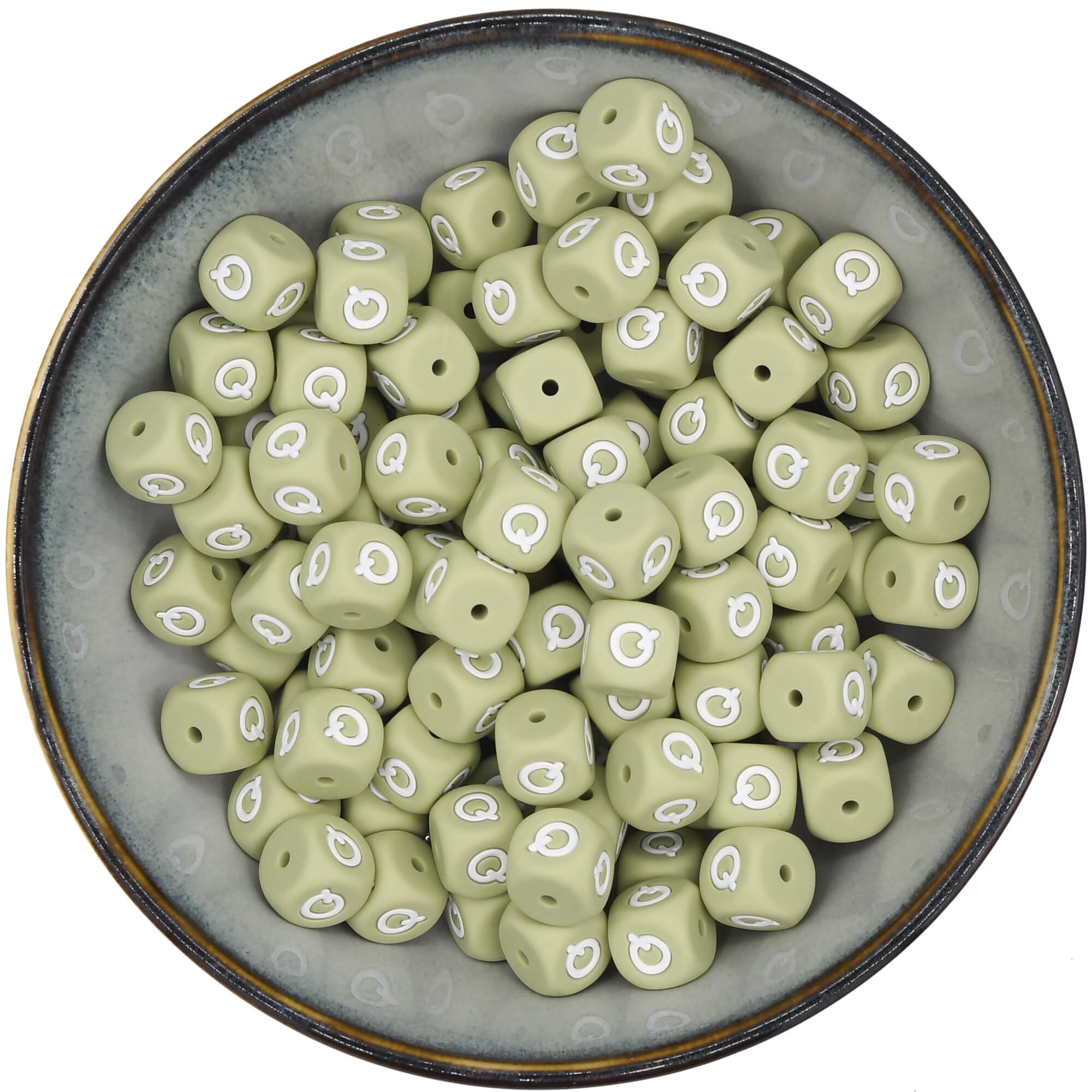 Letterkralen van 12 mm in een vergrijsd groene kleur die sterk lijkt op mijn andere vergrijsd groene kralen.