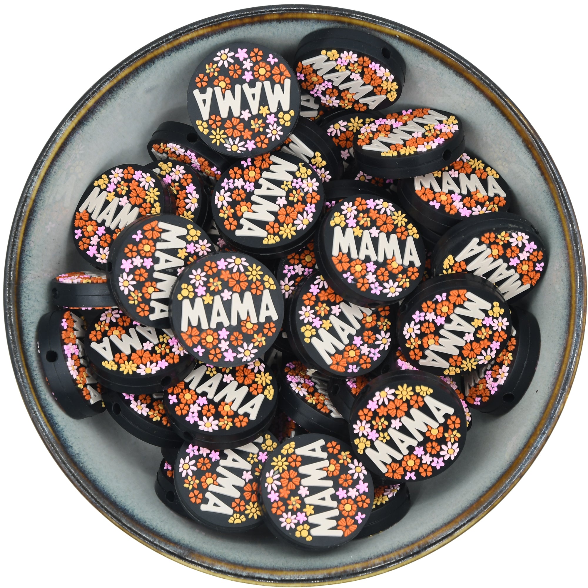 Platte ronde kraal met de tekst 'Mama' en gekleurde bloemetjes.