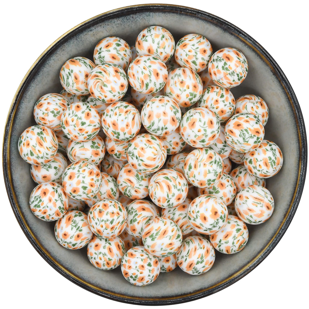 Heerlijk frisse, lente-achtige print met oranje bloemetjes en groene takjes!